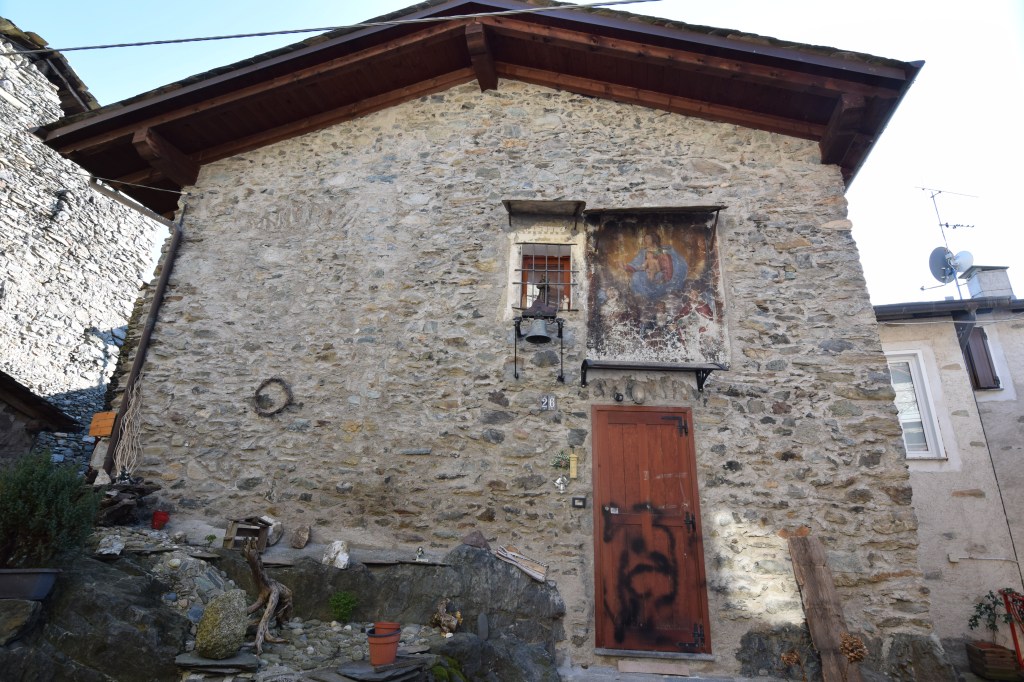 After I found the fourth Wall Madonna painted by Francesco Ambrosione I decided to visit the upper villages of Mangialdo, Barboni and Ruvari – all frazioni of Castione Andevenno – and all very old. But I had to drive through Triangia to get to them. Triangia is a frazione of Sondrio and because I stopped to take a walk I made a really exciting discovery. The parish church was open and there was a 1681 painting of the Madonna & Child between two saints and it looked exactly like the old fresco I found in Gatti! I have offered montages for comparison. On the top left is a detail from the painting I found the 16th-century Chiesa di San Bernardo – the parish church of Triangia. The bottom left show a detail of the Madonna. The painting is dated to 1681. On the top right is the Wall Madonna that I found on a building in Gatti that was dated to 1716. I think they are remarkably similar and could be by the same artist. Here are more views of the artworks.