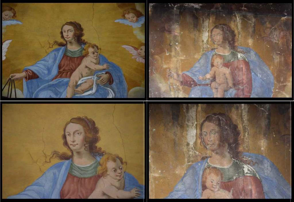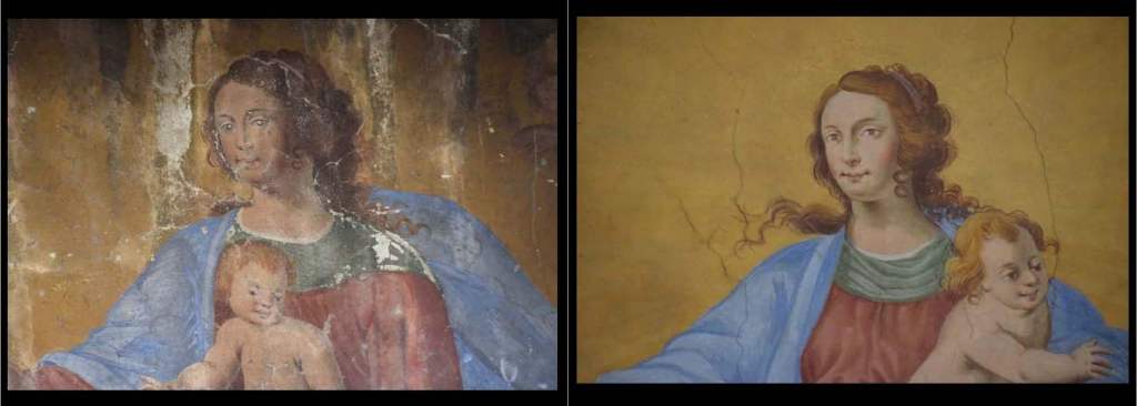 A side-by-side comparison of the head and upper torso of the Madonna – Gatti Wall Madonna on the left and church painting from Triangia on the right. I think the look amazingly similar.