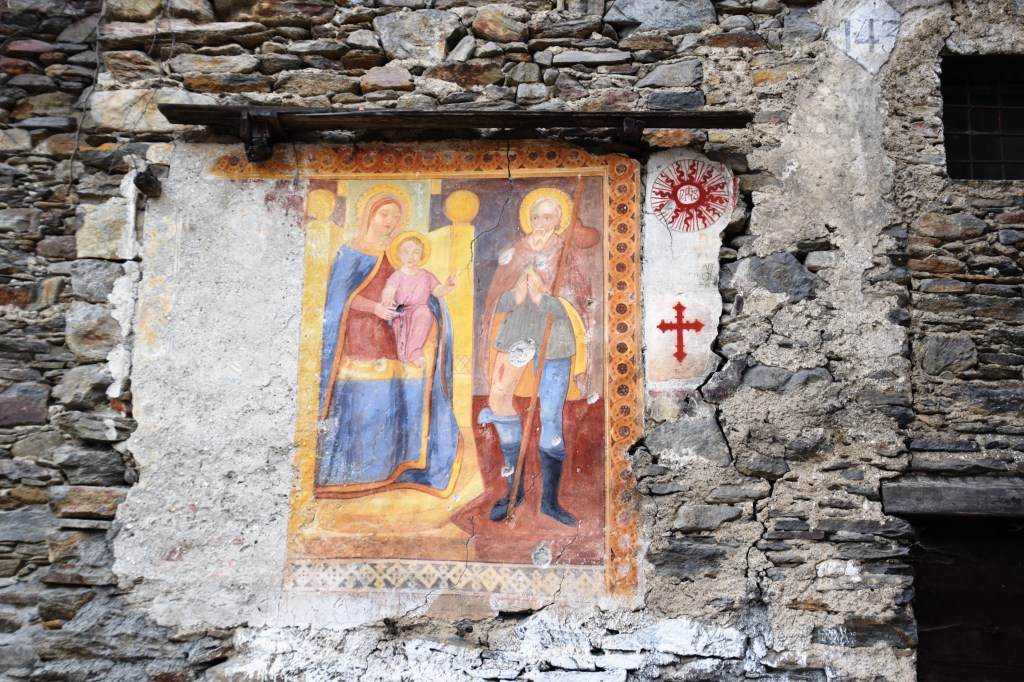 I am certain that Mary was between two saints since the fresco was clearly much larger as can be seen by the remaining ‘frame’. The saint who remains is San Rocco so the other had to be San Sebastiano. This is a plague Wall Madonna. I think it is FABULOUS!!!! The building it is on is for sale! I can only wish! And look closely at the throne and the decoration that frames the fresco. This smacks of the same style of the five other Wall Madonna’s I located in Colorina (3) and Sacco (2).