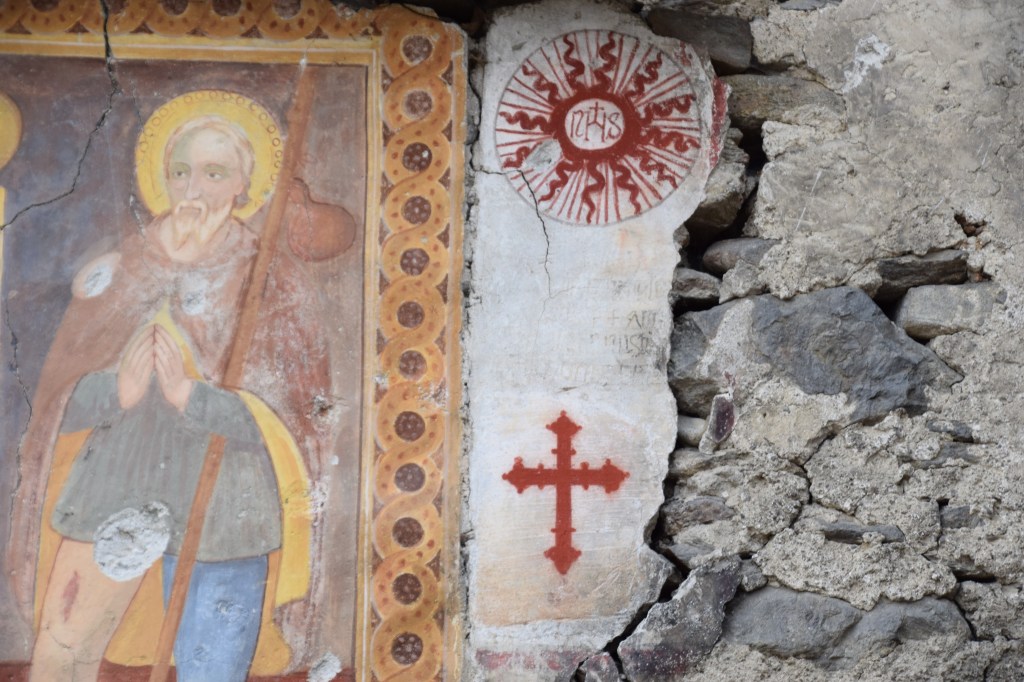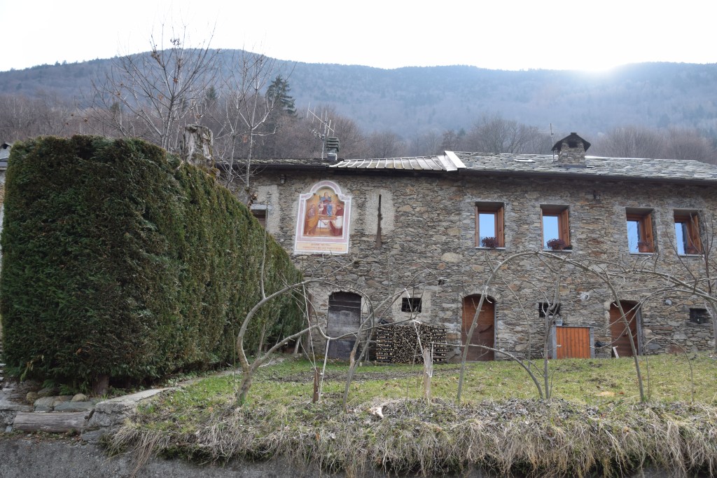 The fresco overlooks the courtyard of a large farmhouse the land of which occupies both sides of the road. The home is for sale. The road into the mountains is newly paved.