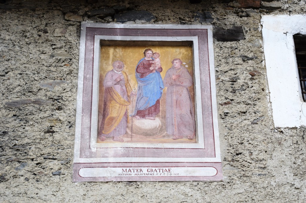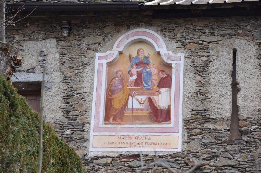 This Wall Madonna will not be visible when the tree is in bloom. I believe this fresco is at least 18th-century if not older. Given the symbology and trying to imagine back from the (decent) restoration I would say this is a tribute to the last great plague of 1630. The sun in the right corner is common in Visconti-Sforza imagery and the Visconti were in Sacco after they fell from power in the 15th-century.