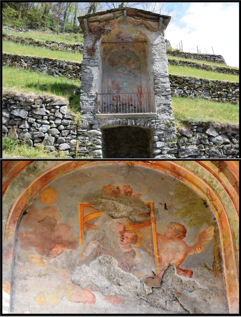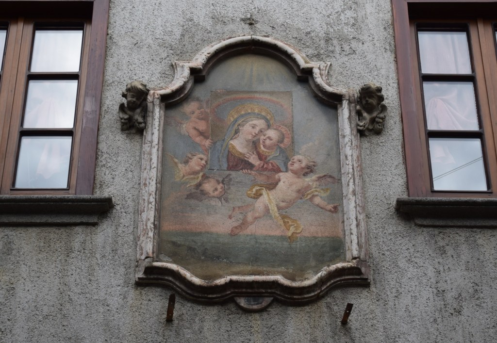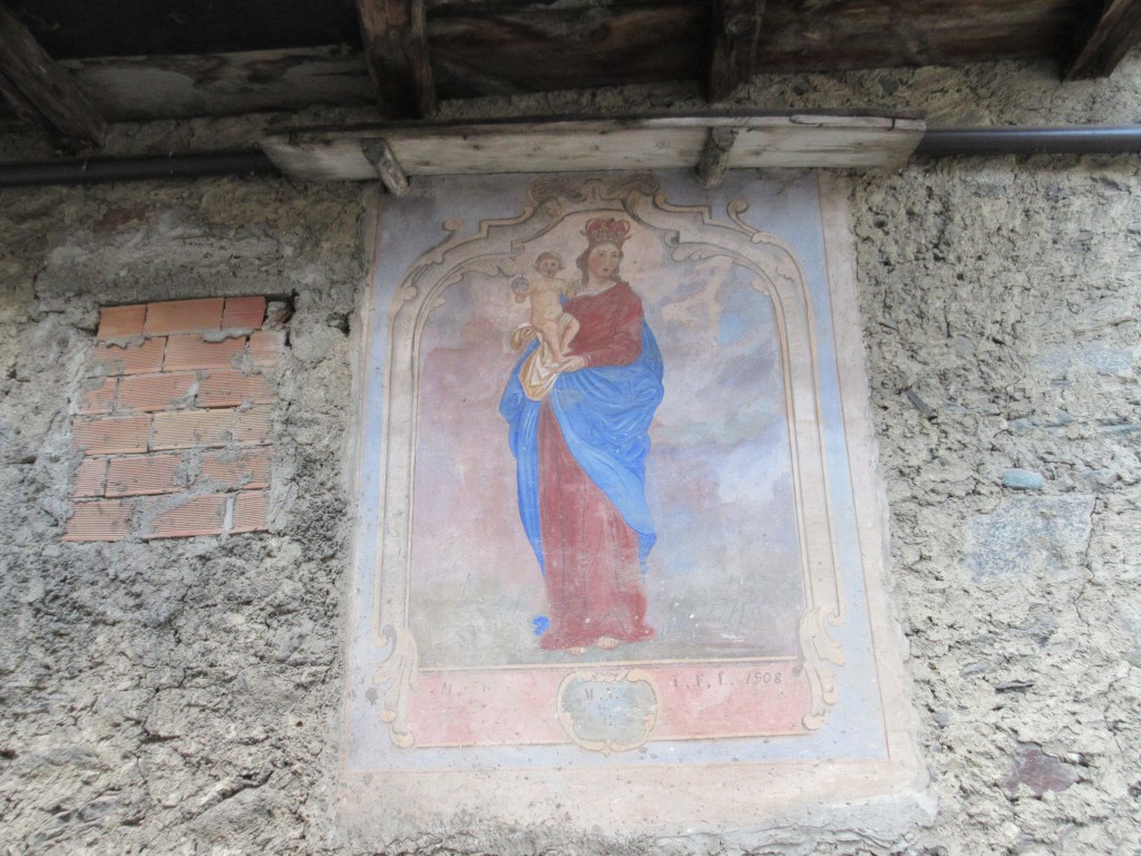 This is a well-maintained Wall Madonna. I like this picture in a picture! It is very 18th-century in imagery which is likely when the Cherub surround was painted. I think the Madonna and child could be older and the addition was a way to preserve and restore what was left of the original fresco. However, I did locate a Madonna shrine in nearby Traona which was dated and – although eroded – has the same ‘picture-in-a-picture’ design. It is posted below.