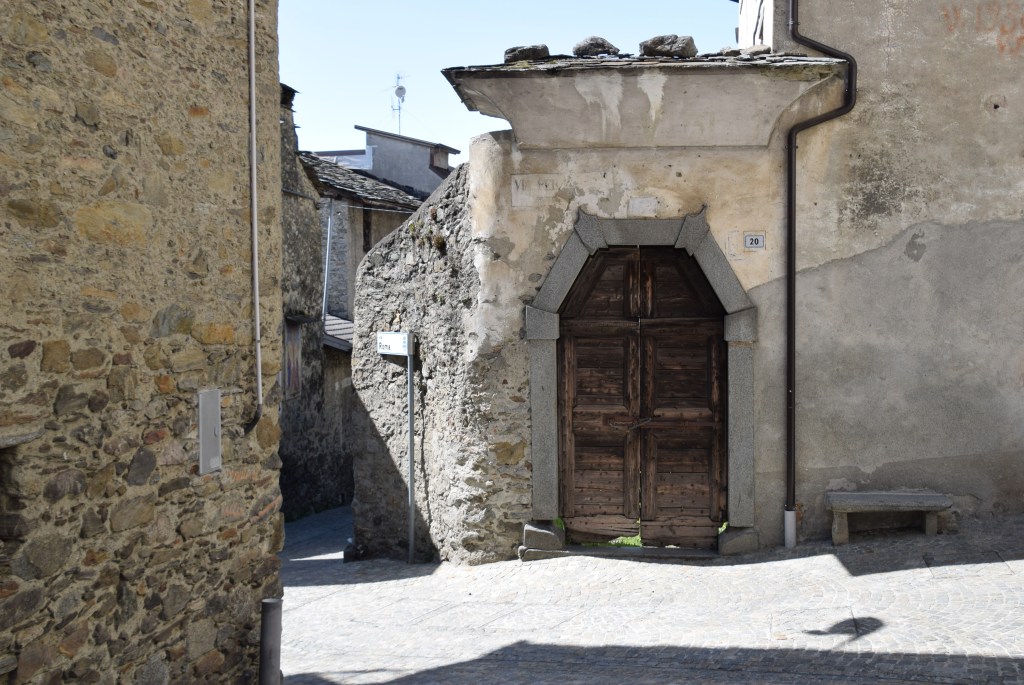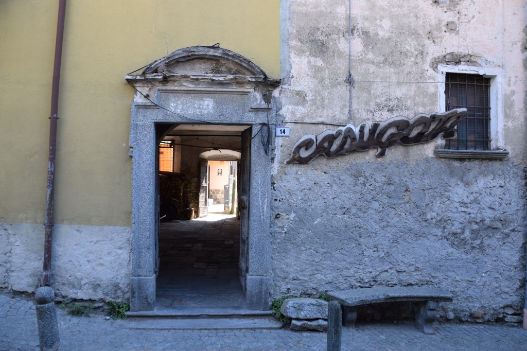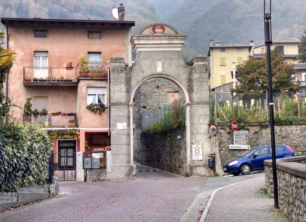 This is the entry gate to the previously walled city of Traona. Traona was a hub for commerce and trade in the Valtellina and it was here in the adjoining customs house – seen to the left – that duty on the goods being brought through the Valtellina was collected. There is a coat-of-arms above the entrance. A swan is featured. This is the symbol; of the Parravicini family – former dukes of Milan.