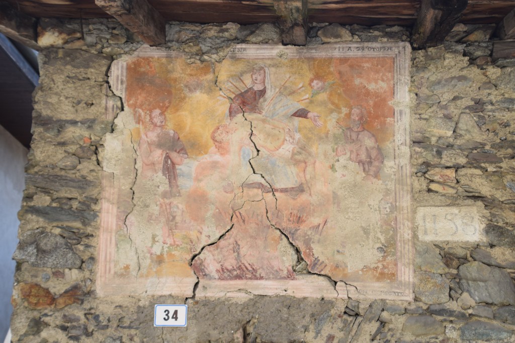 MELLO – I adore this Wall Madonna! This still colorful Lady of Mount Carmel features a crucifixion and with Mary and St Dominic. It is a true crime that the entire building is cracking. soon this fresco may be lost!