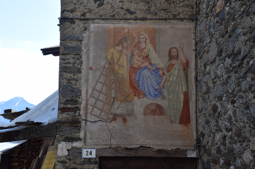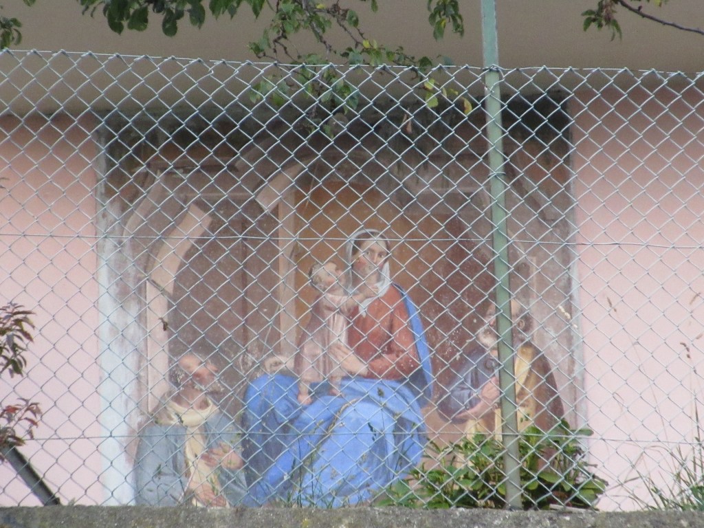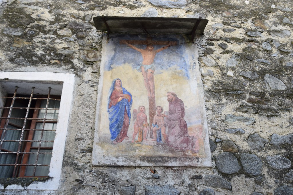 MELLO – Wall Madonna – a very colorful crucifixion. The cover protects the fresco but impedes viewing and photographing. The imagery depicts the Virgin Mary, two angels and St Anthony of Padua (The city is called Padova in Italy). It is common to write the name of the saints below their images in the fresco. There is some legible text remaining that says Antonio. The angels look like they are holding chains. Two close-up photos of the fresco follow.