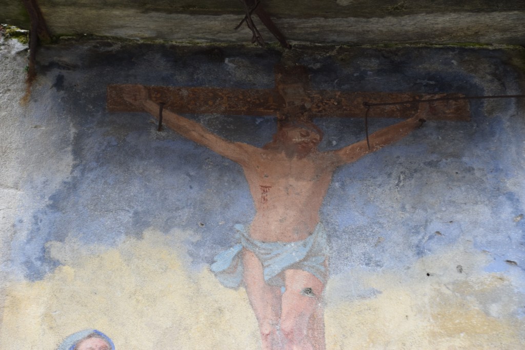 This Wall Madonna was painted in 1905. The crucifixion depicts Mary – in the blue robe, a likely Mary – the mother of St James, and St Joseph. I cannot be sure though but – given the veiled and unveiled images – it seems clear there are two women and one man. That means the likely imagery is of the three saints – two Mary’s and Joseph. The legible text reads: BARAIOLO PIETRO – F.F.L. 1905. Roughly translated this abbreviated text should read: FECE FARE PER [LA] SUA DEVOZIONE – Pietro Baraiolo had this made for his devotion in 1905.