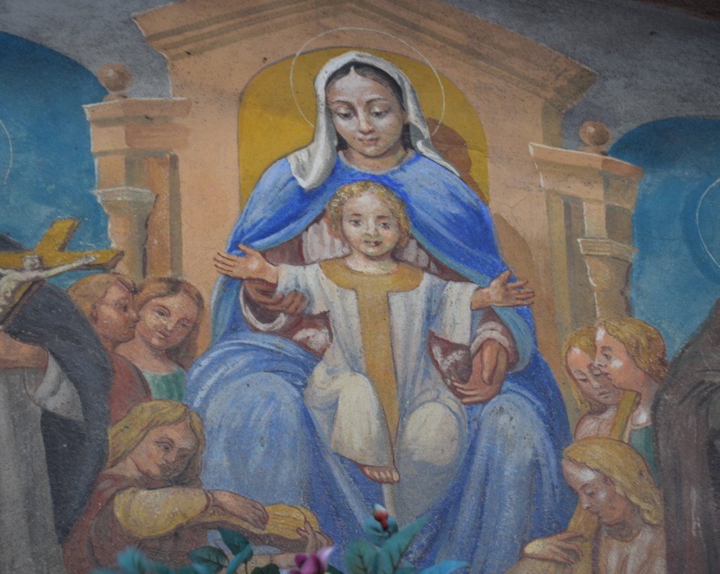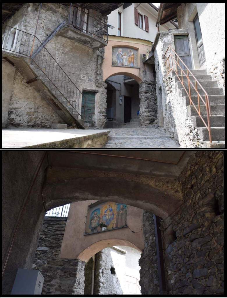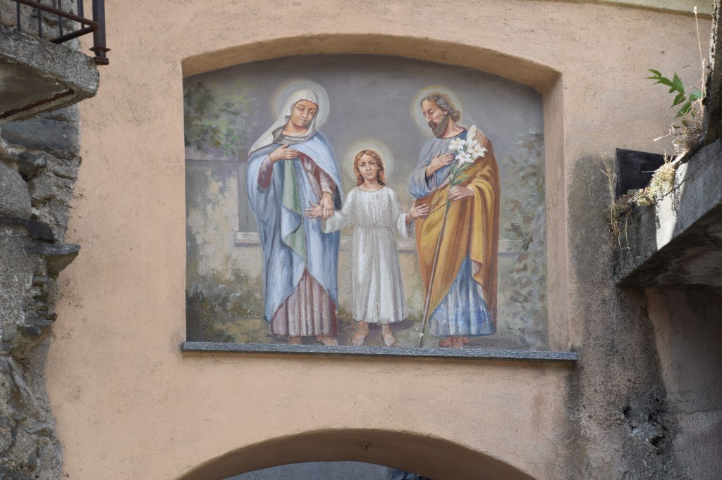 This fresco faces the Valtellina and it the top image from the montage. It shows a Sacra Famiglia – the Holy Family. Joseph holds the staff brought to a betrothal. Legend claims that when 16-year old Mary chose him from all the other suitors, his staff blossomed.