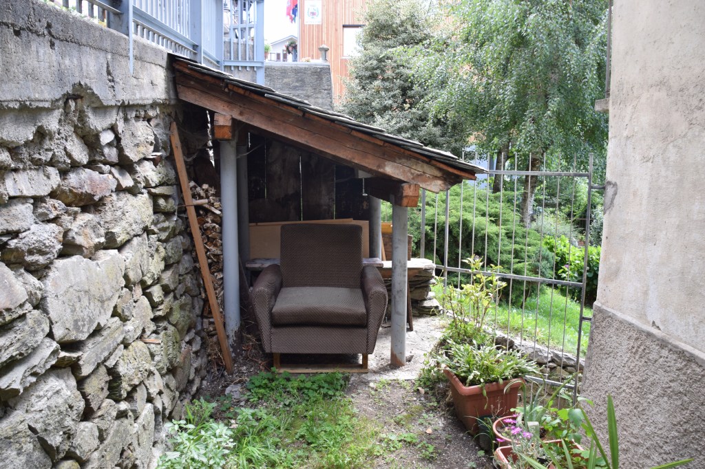 At the far end of the walkway, situated under a hand-built shelter was an overstuffed chair that had – because of its location – no other purpose than to allow the owner to gaze at the Wall Madonna in comfort! Turned sideways the chair would allow the lounger to fill his or her eyes with the green slopes of the mountains that rise up from the Valle del Bitto di Gerola.