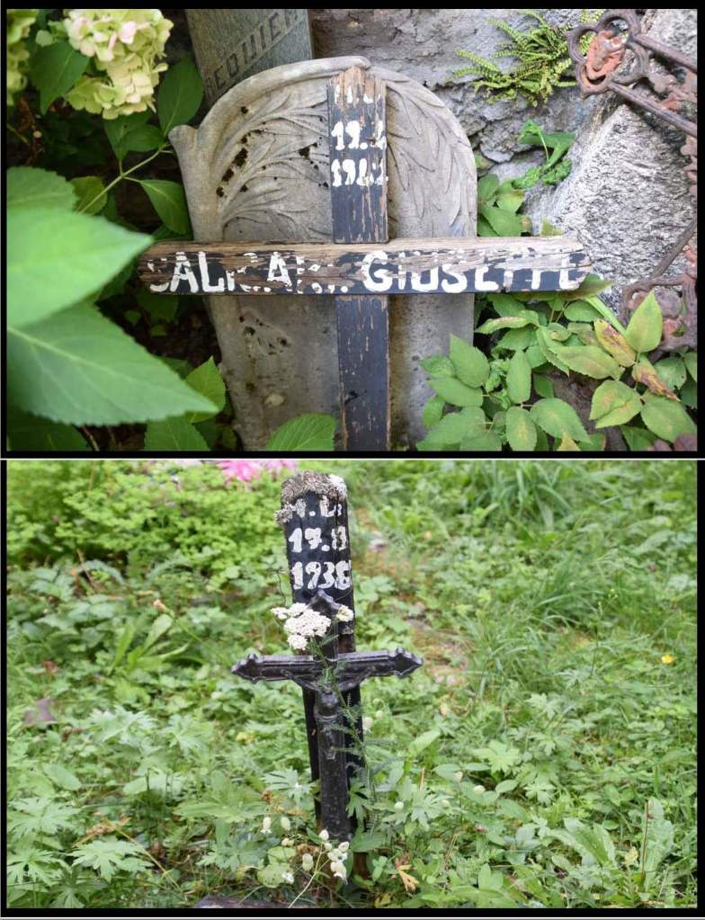 Often, cemeteries marked the graves with a wooden crucifix painted with the name and the years of birth and death. These deteriorated over the years and were sometimes supplemented with a stone marker. Nothing is ever discarded and in these small local graveyards newer stones are placed near to the deteriorated original markers or those markers are piled up in a corner of the enclosed graveyards.