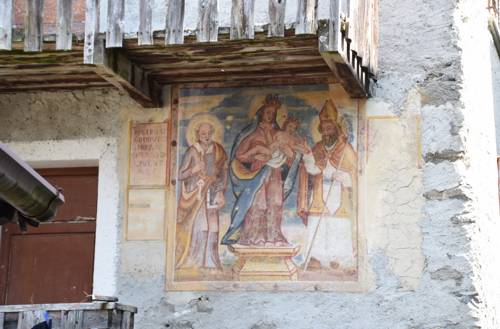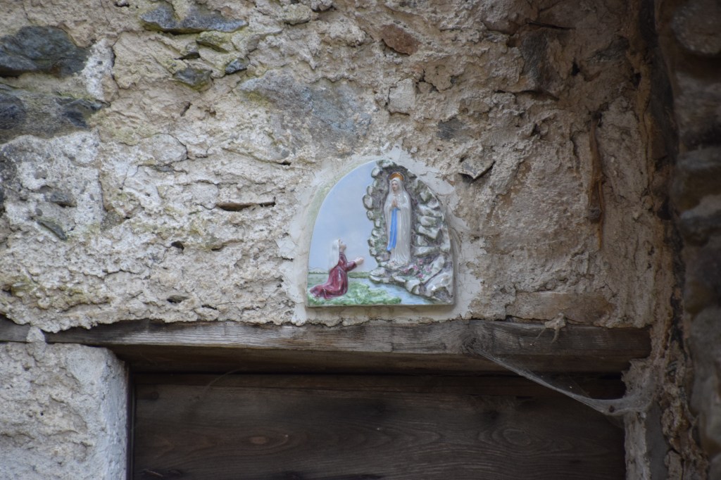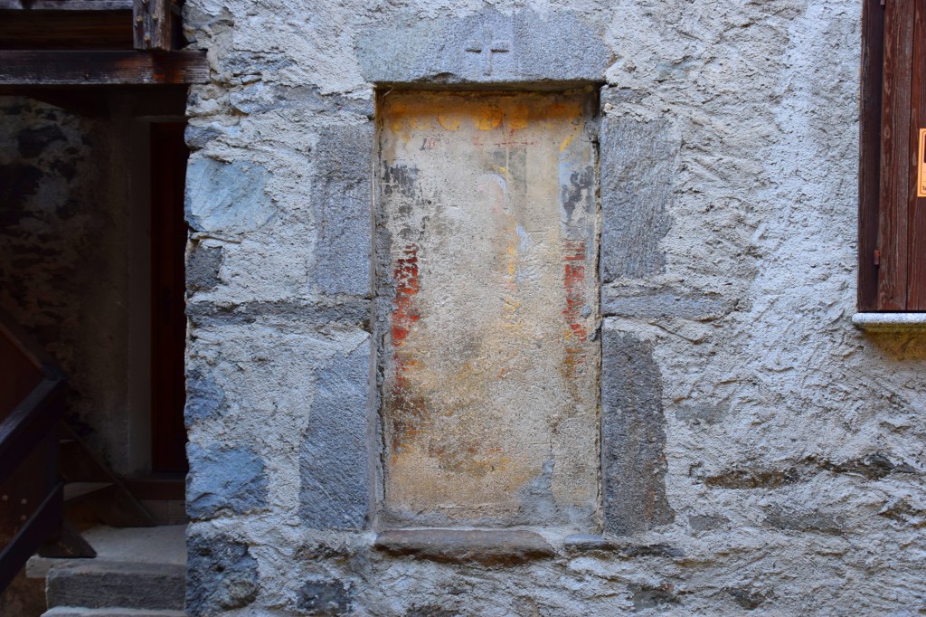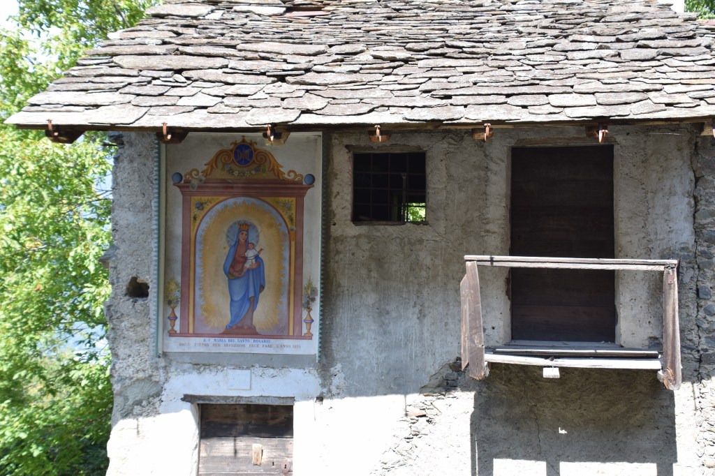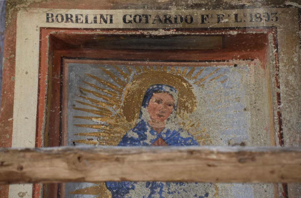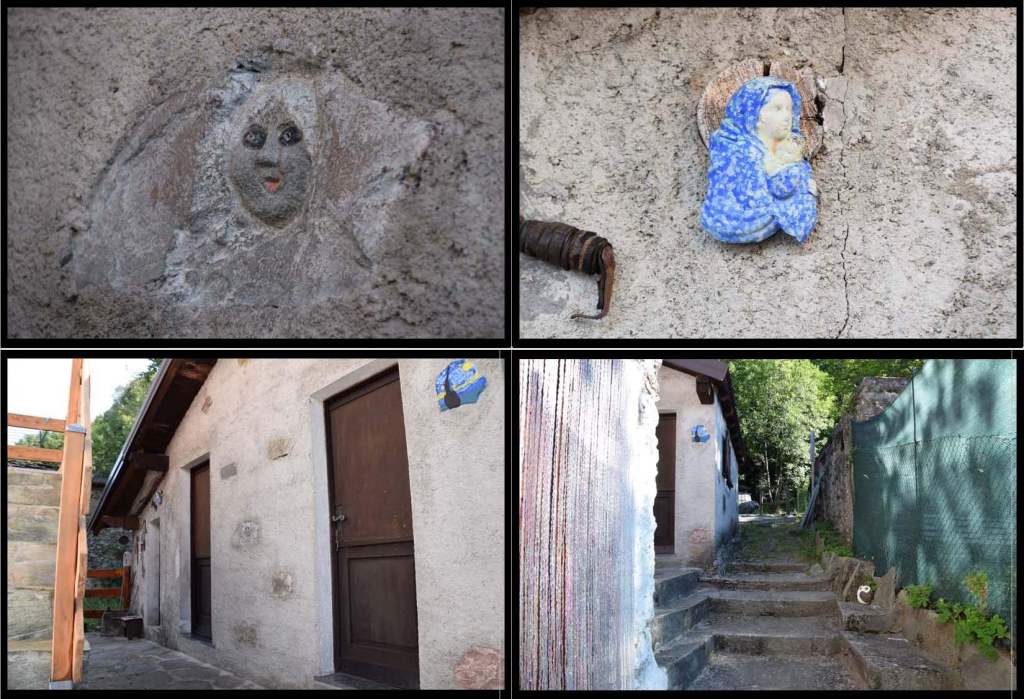 To refresh your memory, Alfaedo is reached from Selvetta on the Orobic side of the Valtellina. The village sits at 803 meters and belongs to the comune of Forcola. Once an important town populated year-round by many families, it is now a weekend and summer destination of those who inherited their homes there and others, who – seeking the fresh mountain climate – bought and rehabbed vended houses no longer used or wanted by their former owners. Because of the isolation of the mountain frazioni, località, and prati, and the lack of change brought to homes used as sole residences there, many of the original Wall Madonna’s still grace the outside walls of the – often crumbling – stone houses.