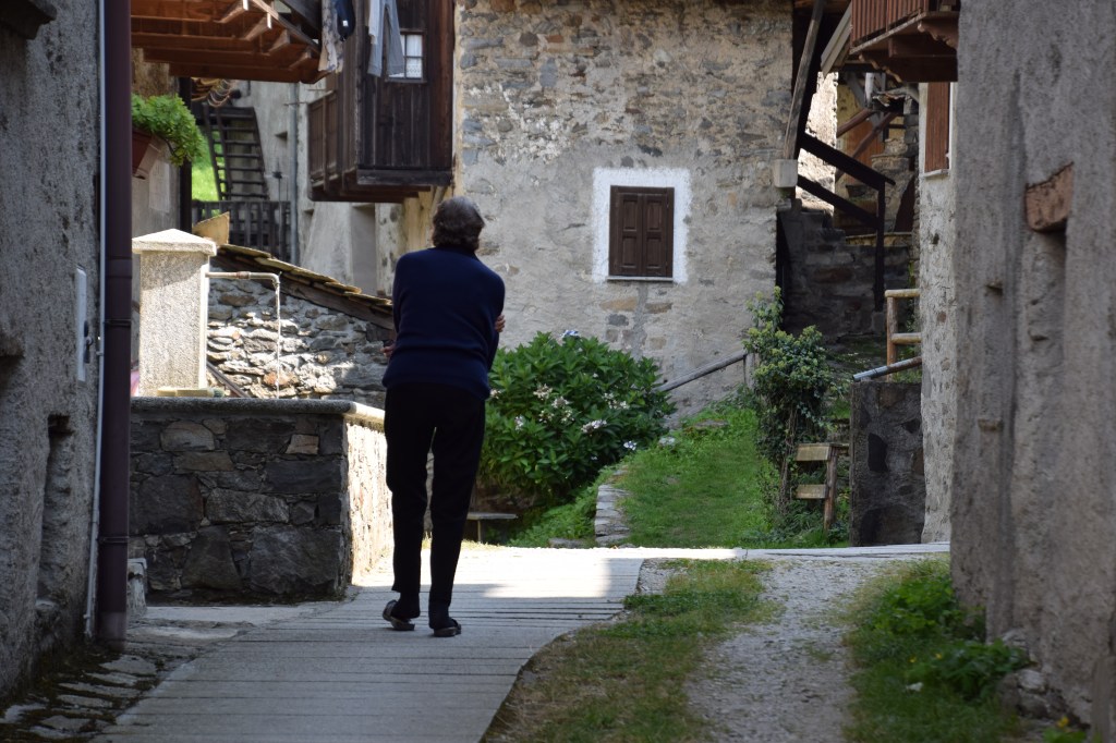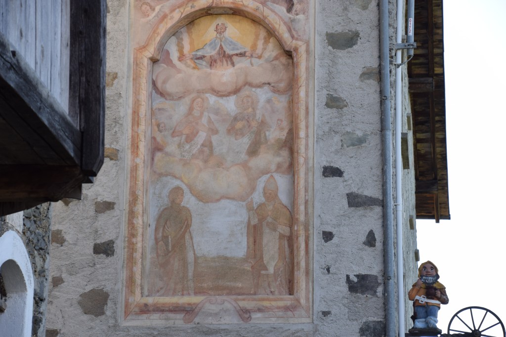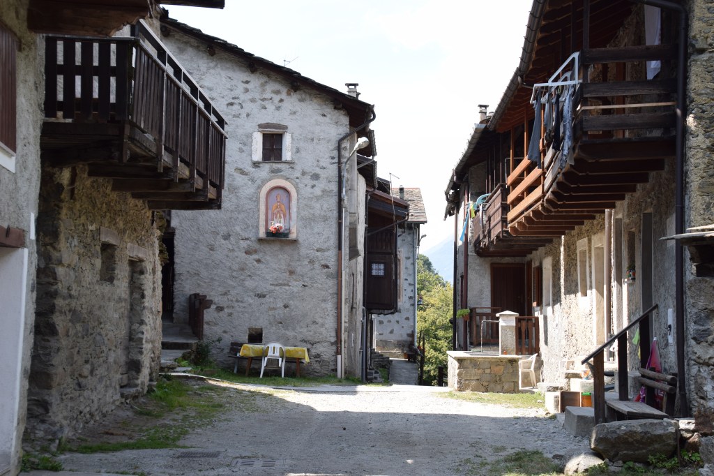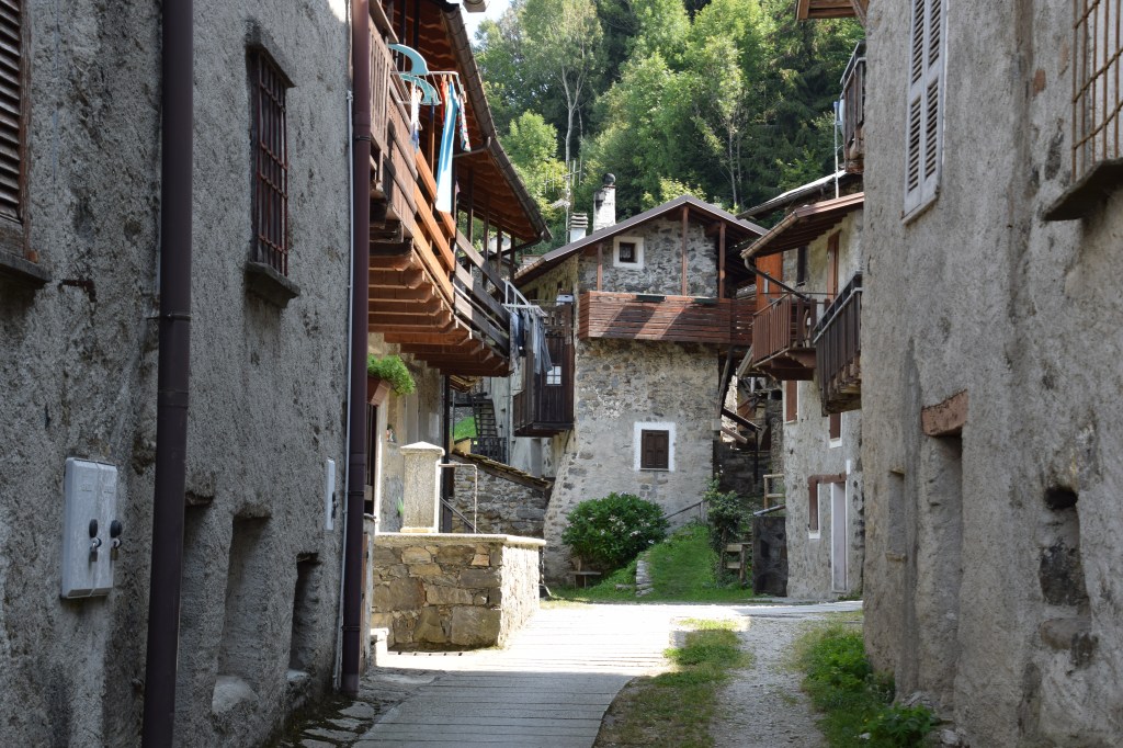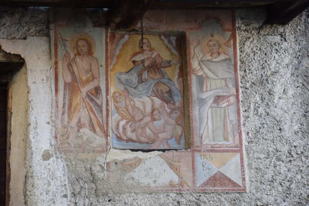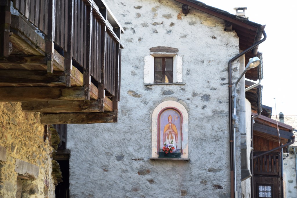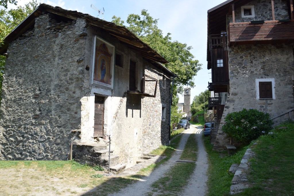 To refresh your memory, Alfaedo is reached from Selvetta on the Orobic side of the Valtellina. The village sits at 803 meters and belongs to the comune of Forcola. Once an important town populated year-round by many families, it is now a weekend and summer destination of those who inherited their homes there and others, who – seeking the fresh mountain climate – bought and rehabbed vended houses no longer used or wanted by their former owners. Because of the isolation of the mountain frazioni, località, and prati, and the lack of change brought to homes used as sole residences there, many of the original Wall Madonna’s still grace the outside walls of the – often crumbling – stone houses.