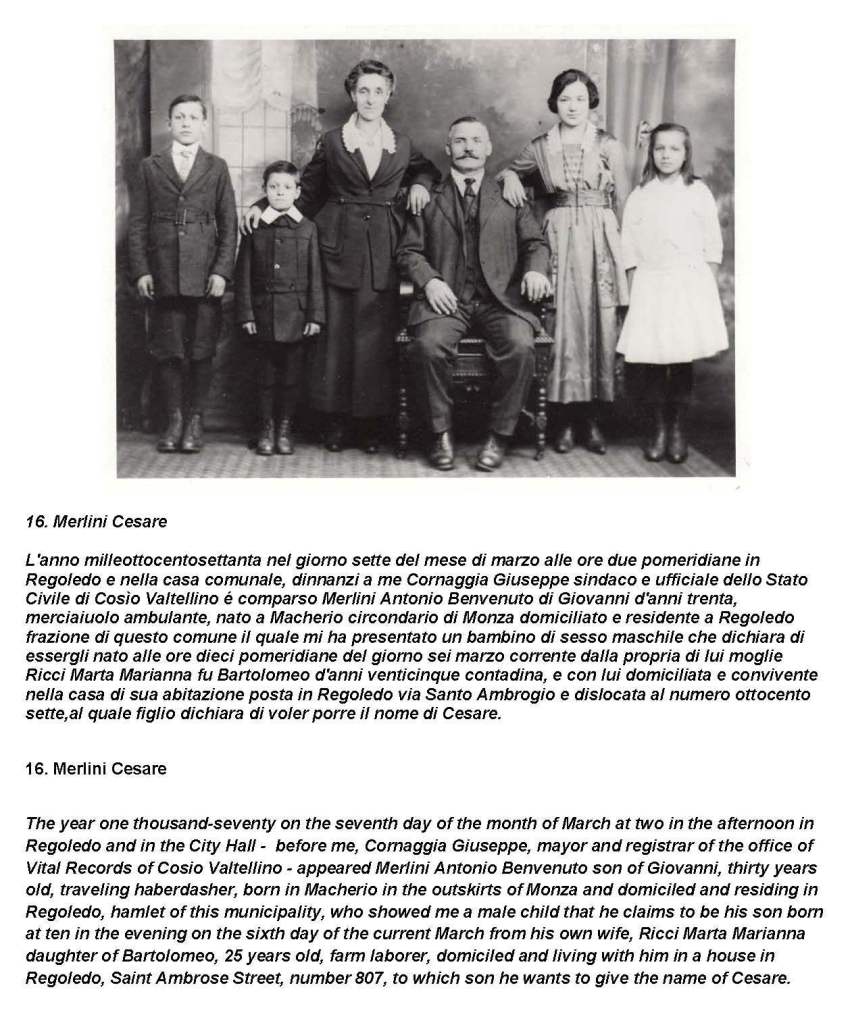 Assuming that the family lived their lives in Alfaedo, one can posit a number of theories for the double tombstone and its location in Selvetta and not Sirta. It could be that Felice Borellini’s wife was born in Selvetta and the couple’s tombstone there is indicative of her birthplace and not his. Or the second tombstone in Selvetta could be reflective of a move down the mountain from Alfaedo to marry and/or to live. It, also, could be that the designation ‘Forcola’ is generic for any village in the territory. But I do not think this is the case since all other Borellini’s were listed as being born in either Faedo or Al Faedo and the mother of the Borellini siblings – Teresa Libera – is listed as being born in Al Prato. Because of the specificity of these location names, it would seem they came from vital record data the conventions of which may change over the years but the requirements of which in terms of accuracy do not. Although I contacted Elizabeth Gusmeroli and posted the tombstones of Giuseppe, Teresa, and Felice on the ancestry website, I have not heard from her to date. Hence, these musings are speculative and not conclusive. Here is the link to the genealogical information: https://www.geni.com/people/Giuseppe-Borellini/6000000091523797971
