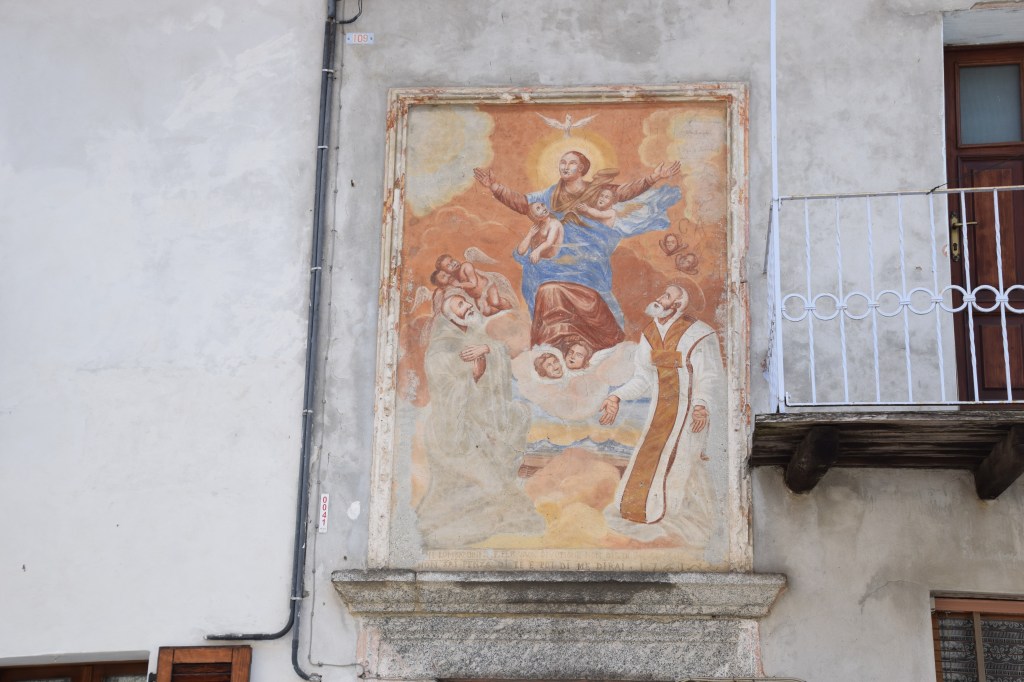I have photographed the one Wall Madonna in town many times because this is where I walked every day when I stayed in Dazio. But I never noticed the faded and elaborate inscription and date on the bottom of the fresco. Today I noticed it and after a fruitless effort at translating it because I knew it was some ‘saying’ or old idiom, I sent it to my polyglot, genius friend.