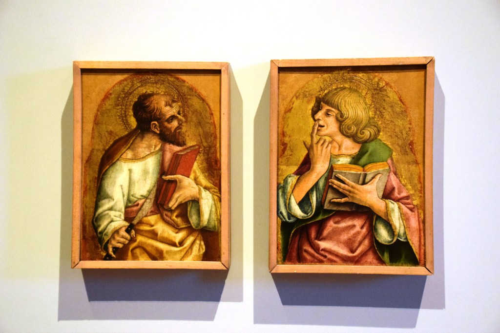 These two works were painted in 1472 by Carlo Crivelli. Carlo Crivelli (1435-1495) was a Venetian painter whose style is so distinctive as to make his paintings identifiable by someone like me – a casual consumer of Italian sacred art. Crivelli’s life was as distinctive as his style and, indelibly marked and altered by the six months in prison and banishment from his hometown of Venice that he endured for the crime of adultery with the wife of an absent sailor – a woman no one could call an Evangeline!