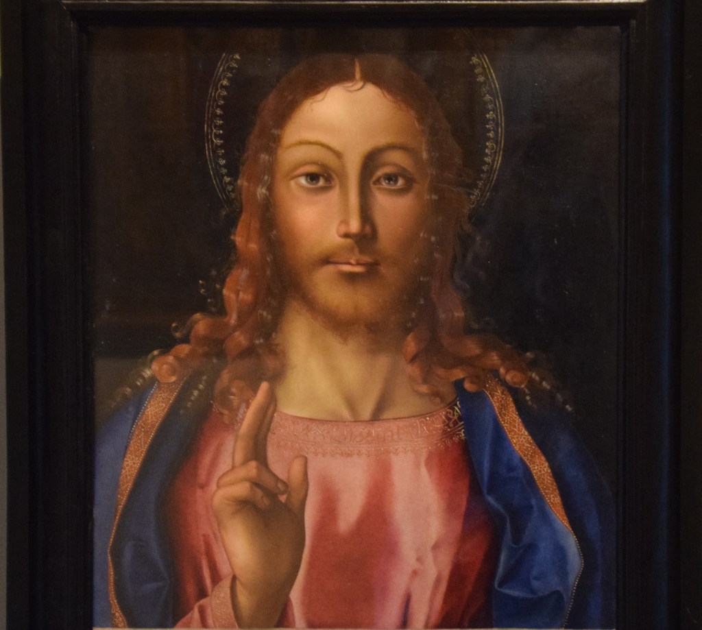 I really like this colorful Jesus – bright and almost happy looking. If one stands close enough, one can see that the painter carefully painted each strand of Jesus’ auburn hair. The techniques used to create this oil-on-wood painting come from the Flemish culture used from the 1400’s in Italy.
