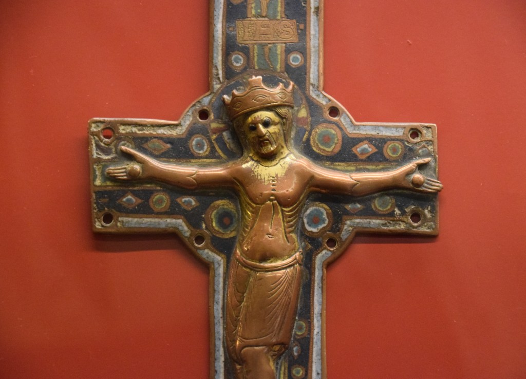 This wonderful crucifixion was made in France. The technique of creation is called ‘champlevé’ which is “enamelwork in which hollows made in a metal surface are filled with colored enamels.” I really like this beautiful work!