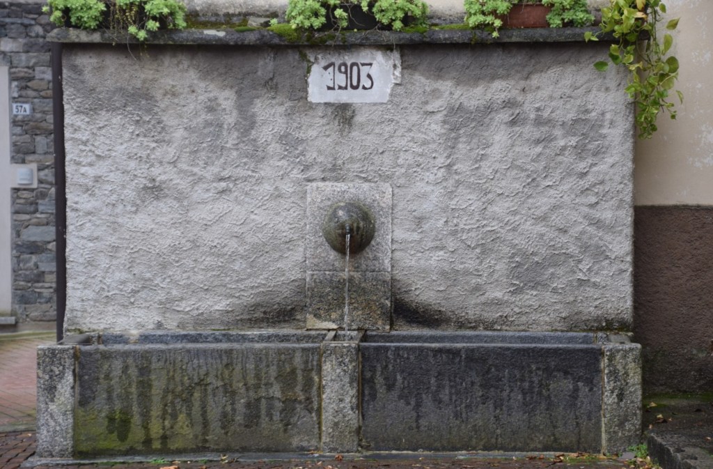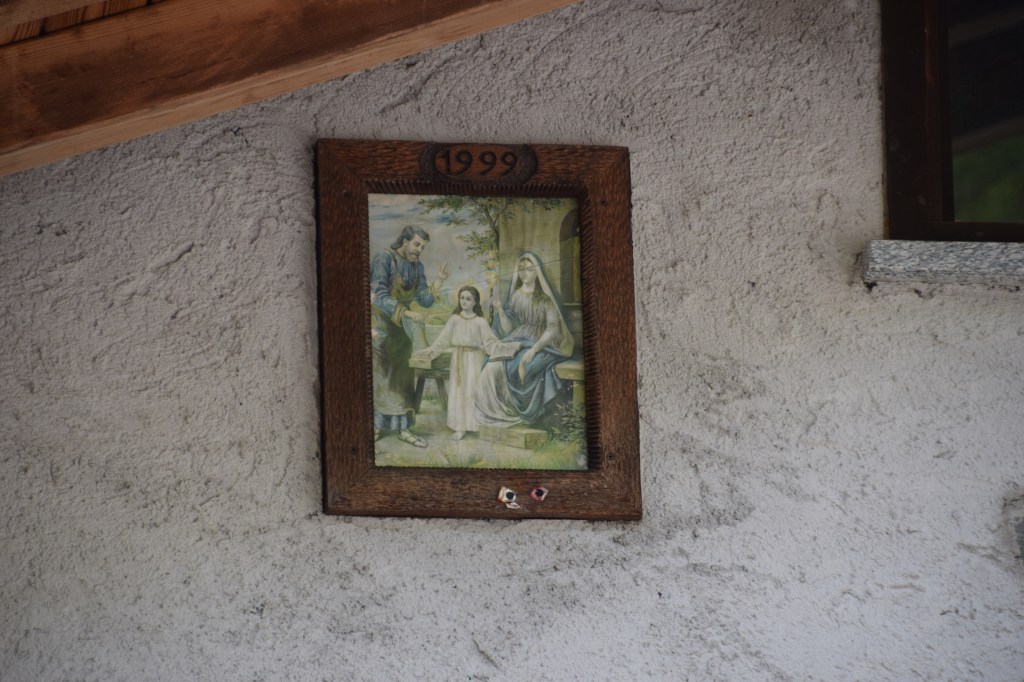 This is a beautifully restored 19th-century home that hosts the modern Sacra Famiglia pictured and described previously. At the top is the story of the home. In the full-frame, one can see my walking stick, sweatshirt, and camera bag. I only carry one walking stick because in my other hand is my camera. The story carved in wood is in the Valtellinese dialect. I will add the translation soon!
