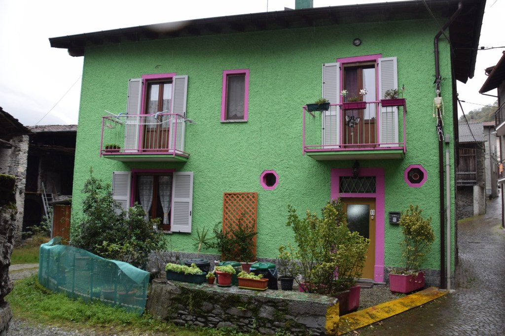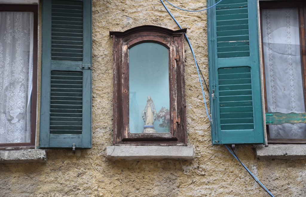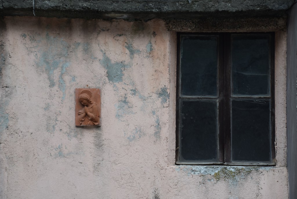 A very colorful and quirky restored home is surrounded by unrestored homes mostly used as barns. What follows are the modern Wall Madonna’s I found in the village. This ‘modern’ home begins the walk through a historic tradition of devotion continued in our current time.