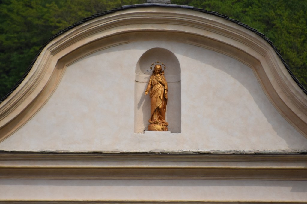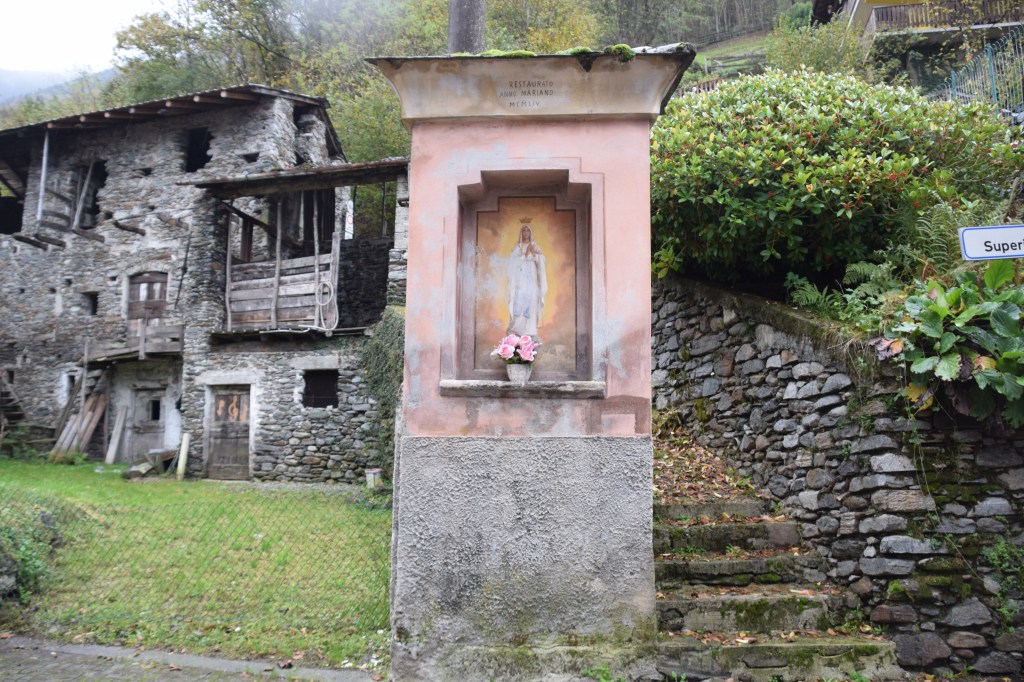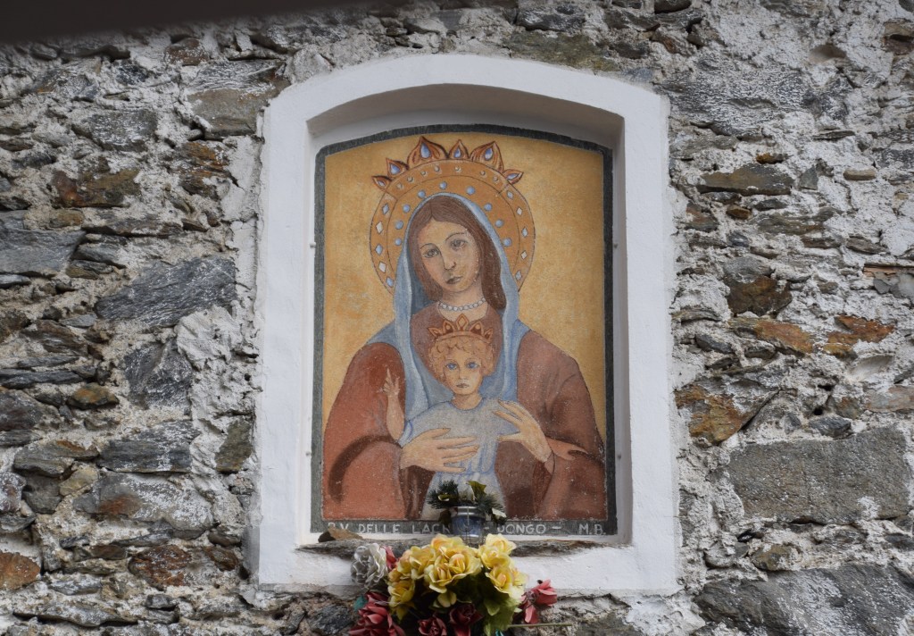 Back in Andalo Valtellino and on the road that leads into the mountains is a wonderful shrine of the Virgin ascended. Shrines such as this are always found along the mule paths that were the ‘highways’ of old. This shrine was restored in the Marian Year 1954. It is telling of the devotion of the town that this lovely shrine was how the people abided the papal proclamation that declared 1954 the first international Marian Year in the history of the Catholic Church. A Marian Year is a calendar year that a religious leader declares to be a year that the Great Virgin – specifically – is to be celebrated and acclaimed. In 1953, Pope Pius XII made 1954 a Marian Year in his encyclical Fulgens Corona (Radiant Crown). The year 1954 was the 100-year anniversary of the written stipulation of the details of the church dogma declaring Mary to be of Immaculate Conception – conceived and born free of ‘original sin’ – the church teaching that all are born with the sin of Adam and Eve. The theological position on Mary’s conception has long been debated by Christians and only the Roman Catholic Church has made it specific and its belief a required matter of faith. The dogma is rejected by Protestants and the Eastern Orthodox Church. The Great Virgin is the commonly chosen saint for intercession against the plague and other illnesses and woes. It is some variety of her image that one finds all over the Valtellina.
