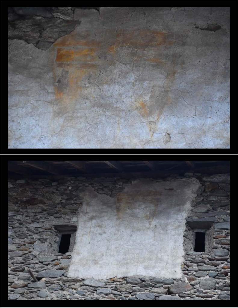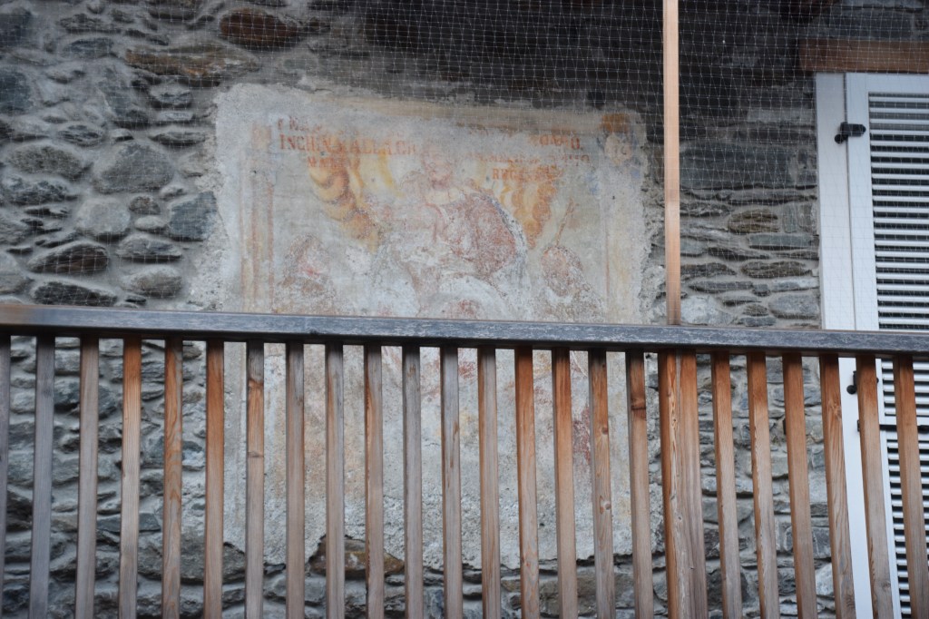 Because I have only walked to Piazz, what I offer here are those frescoes found in that localita’ at 466 meters above the valley and in the valley floor village of Andalo Valtellino.