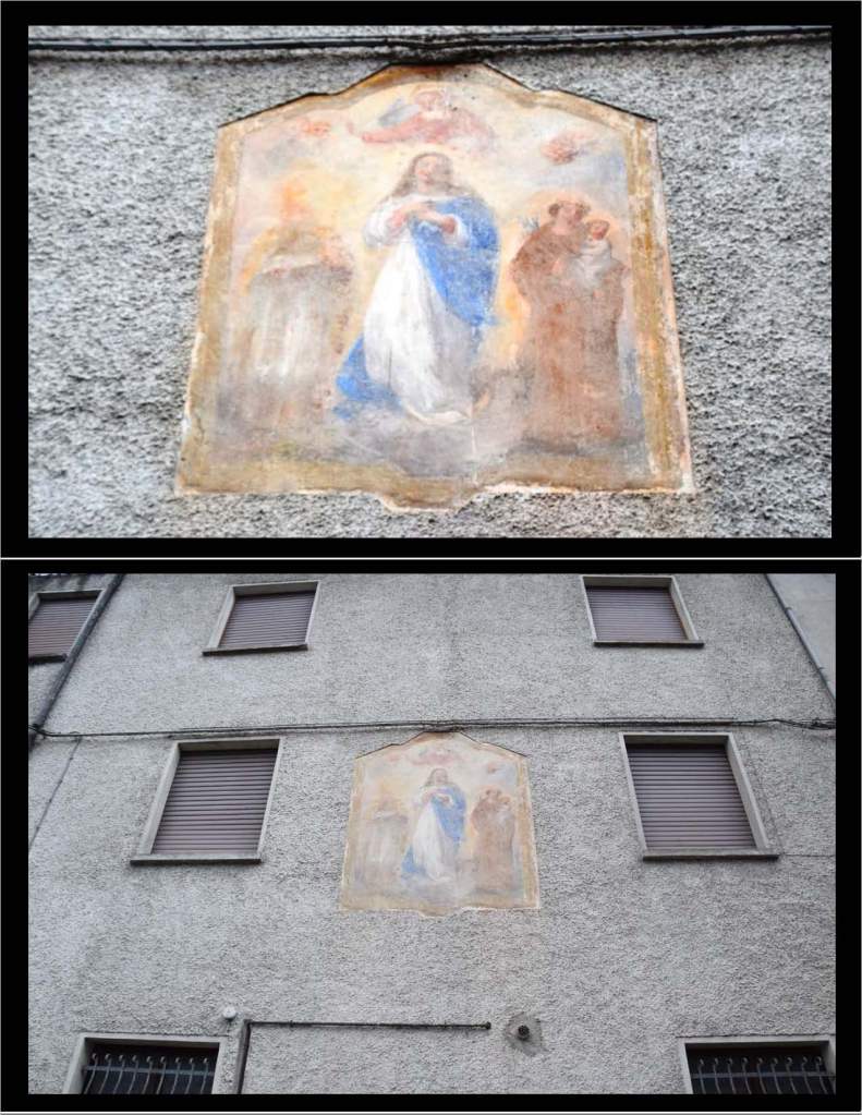 This Wall Madonna, also found above the entry door of a home in Piazz the front of which faces the piazza, is likely 18th-century originally but eroded and replaced with a more modern image of the Madonna and Child.