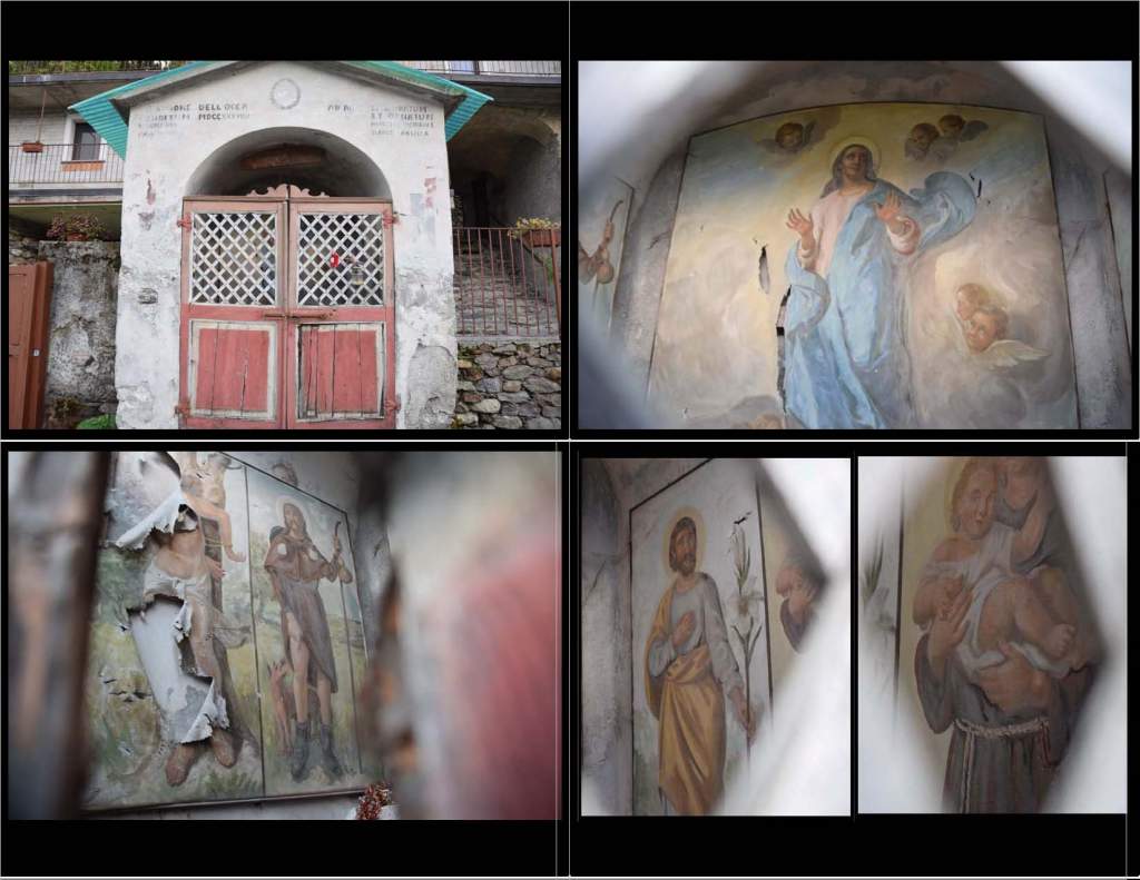 To the left of the home in the previous photo and near the end of the cobbled lane that merges into the old road that travels laterally to Rogolo is this still lovely but difficult to view Madonna shrine built in 1739. Inside one finds a Vergine Assunta with Saint Sebastion and Saint Rocco to the left and Saint Joseph and Saint Anthony of Padova to the right. This is a plague Madonna – one that seeks intercession against the Black Death. This is the oldest part of the town. The once very beautiful and ornate shrine has been restored with the flanking saints painted on hard medium and installed over the original frescoes. Even the restoration is deteriorated. The door cannot be opened due to rust and the warping of the wood. I think the doors are a later addition. The photos are the best I could do between the cracks and the lattice. The original inscription remains and lists the author’s name and date of construction to the left and the donors’ names to the right. From what I can see and translate – the original donor was a Dell’Occa and the date 1739. And it seems the shrine is in memory of Vittorius Margolio and Ancilla Girolo Ancilla. I asked a friend who is an expert in Latin and reconstructing dialects to translate the inscriptions. Here is his entire reply: