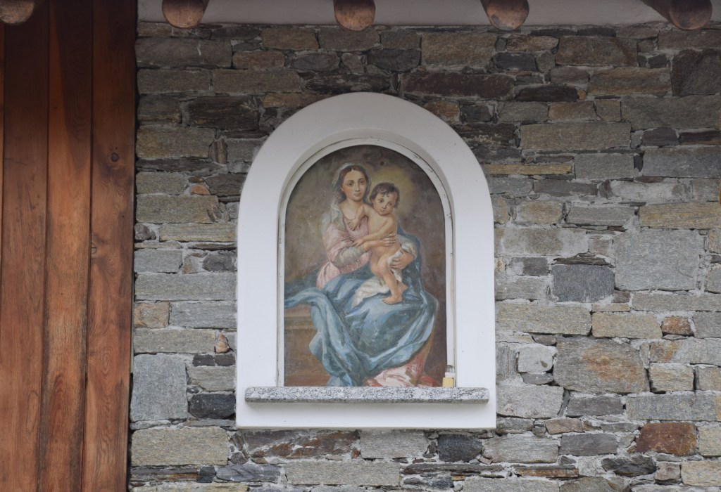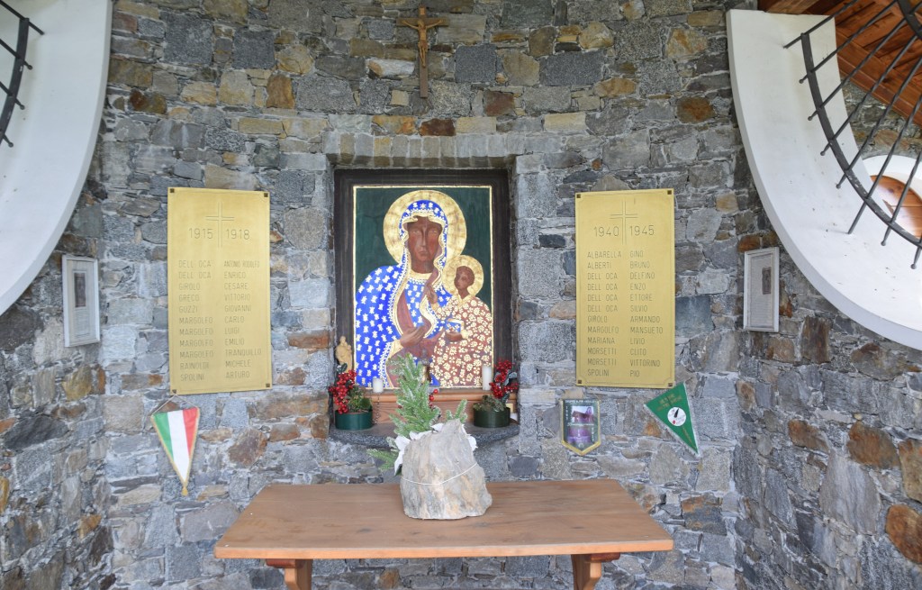 The Tempietto degli Alpini built and dedicated in 1999 is an open-front shrine with a small belltower and a room that can be used by the local Alpini Group – the Grupo Alpini Andalo. The shrine is dedicated to the men of Andalo Valtellino who died in the two world wars. The frescoed Madonna and Child is bright with gold and very beautiful. She is a dark-skinned Madonna after the Orthodox style and the style popular in Sicily – a place to which many Valtellinese men migrated for work in the 15th to 17th-centuries. The Black Madonna – as she is called – symbolizes strength and power and this image was likely chosen to speak to the character of the caduti – the fallen who died fighting in the wars.