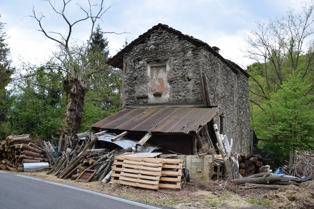 To close this brief narrative is a full, side-view of the home with the fresco featured in this post. Dating at least to the 18th-century, this home fronted the old road into the mountains. The new, wider road likely robbed this old home of its front yard. When SP4 ends in both Dosso del Liro at 690 meters and Livo at 675 meters both roads continue as Strade Agro-Silvo-Pastorale (Agricultural, Forestry, and Pastoral Roads) high into the mountains ending at tiny borgos used only in summers to pasture animals and lacking public utilities. These roads are maintained by the local communities and are narrow, not always paved, and lacking guardrails. They are not for public use but can be accessed by buying a ‘ticket’ that usually costs fewer than 5-euros.