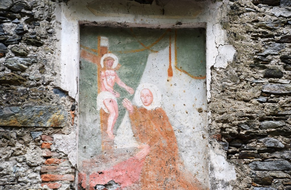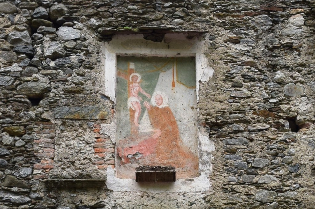 MULINI: This is an interesting fresco from the Localita’ Mulini just outside Dosso del Liro above Lake Como. It is a crucifixion scene interpreted by an artist whose imagination outstripped his talent. When Michelangelo sculpted his famous Pieta, he made Jesus much smaller than Mary in order that he could lay across her lap and poignantly render the scene. The artist here has done the same and indelibly fixed the ‘child’ Jesus in our minds as he reaches from the cross for the outstretched hands of his mother Mary. This fresco is as eroded as the home on which it lives but I really love it – the unique translation of the sacred scene, the bright colors that describe the dark event, the faith of the donor so clearly defined, and the pathos we must feel for the mother whose child dies before her eyes. In its imperfection it is perfection!