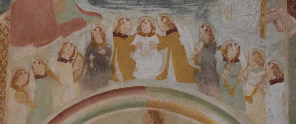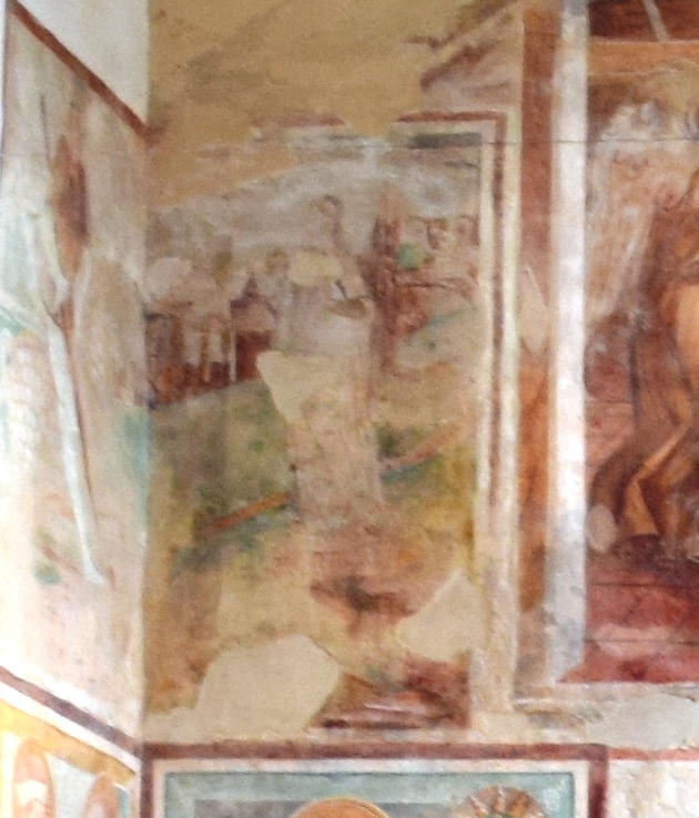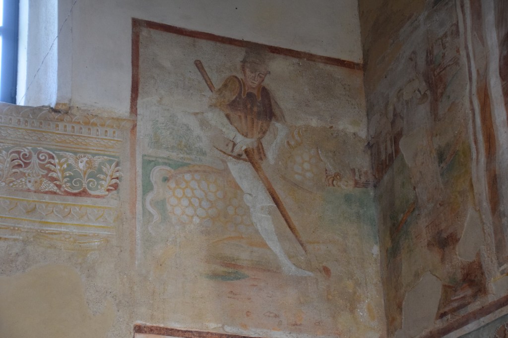 This corner fresco spanning the corner of the north (left) wall and the corner of the east (altar) wall shows the patron saint Giorgio (left) on his horse and rescuing the princess (right) from the dragon speared and dying at his feet. Legend holds that this event occurred in Libya and Giorgio’s only ‘payment’ for his deed was that all in the kingdom converted to Christianity. The flag San Giorgio carries is white with a red cross – the same flag that images of the resurrected Christ show Jesus holding. Saint George was from Cappadocia, Turkey and he was buried in former Lydda – now a part of Israel.