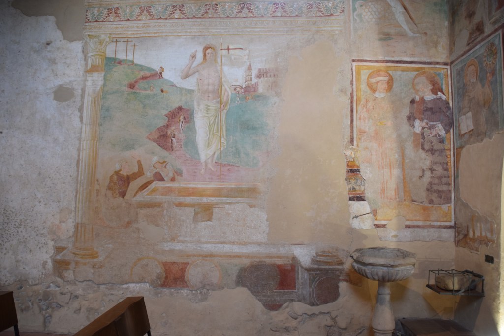 This fresco is on the north (left) wall and depicts a wonderful rendered Resurrection with Jesus holding the flag of the Redeemer and the ‘good’ or ‘buoni’ rising from their graves to join him in Heaven. To the right of Jesus is a fresco of the martyred twins – Cosmos and Damian – who were 3rd-century Arab physicians and Christians. The brothers who practiced medicine for free as a duty to their faith, were executed for that faith in Syria during the persecution of Christians by the Roman emperor Diocletian who reigned from 284-305.