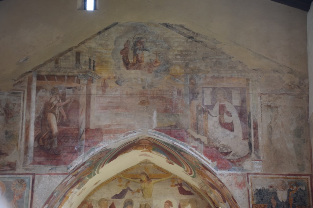 The triumphal arch is decorated with the traditional depiction of the Annunciation. The fresco is quite faded but shows the Archangel Gabriel to the left and the Virgin Mary to the right. God the Father is above them in the center and a barely visible Holy Spirit shooting beams of impregnating light can be seen above Mary’s head. To the far right was once pictured a ‘knight’ saint who was associated with Saint George – the patron saint of the oratory. He is not identifiable. Note that the fresco actually extended to the ceiling of the original building. The blank space is where the walls and roof were raised.