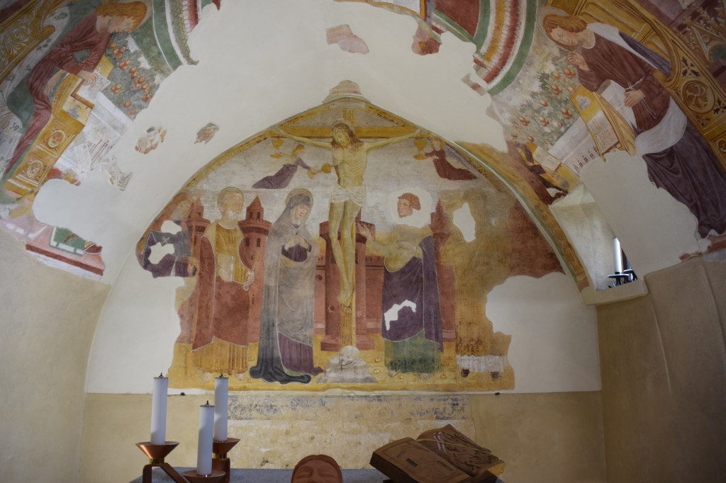 This is an unobstructed view of the chancel (altar) wall showing the crucifixion of Jesus with the Magdalene, Saint Peter, Mary the Virgin, and John the Evangelist. Above one can see the part of the apse ceiling painting that depicts Christ the Redeemer surrounded by the Evangelists.
