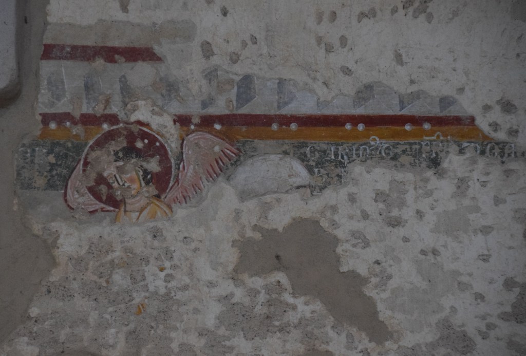 On the south / right wall is found a true treasure. This is a fabulous remnant of the original frescoes covering the walls of the oratory. The works were painted during the Romanesque art era. A major characteristic of the imagery of this artistic period was its lack of ‘naturalness’ or humanistic features. The faces and bodies look static and devoid of emotion and movement. Although not as rigidly executed as the sacred images found in the Byzantine icon painting, these frescoes in their ‘flatness’ can be easily recognized by even the amateur art lover. These ‘old-fashioned’ 12th-century frescoes were covered up and replaced with the ‘newer’ 15th-century frescoes we see today. We can thank the wall preparation and painting techniques of that time period for this fantastic image of an angel with colorful pink wings viewing a long-lost sacred scene or personage. Before a fresco can be painted, the wall must be prepared. The wall was covered with three layers of plaster – the final layer often being mixed with marble dust. Before the final layer dried – while still wet – the artist painted the images. Because the plaster was wet, the paint amalgamated with the gesso mixed with marble. Hence, the imagery did not sit on top of the plaster base. It was part of it. That is why we have the good fortune to be able to see what was under the newer frescoes. And if one compares this small image that is crisp and bright to the more faded and younger images the durability of this ‘lost’ technique of fresco painting is clear and easily recognized. The artists who used this method had to be exacting and very talented. There was no correcting an error by painting over a mistake. A mistake was forever merged with the wall.