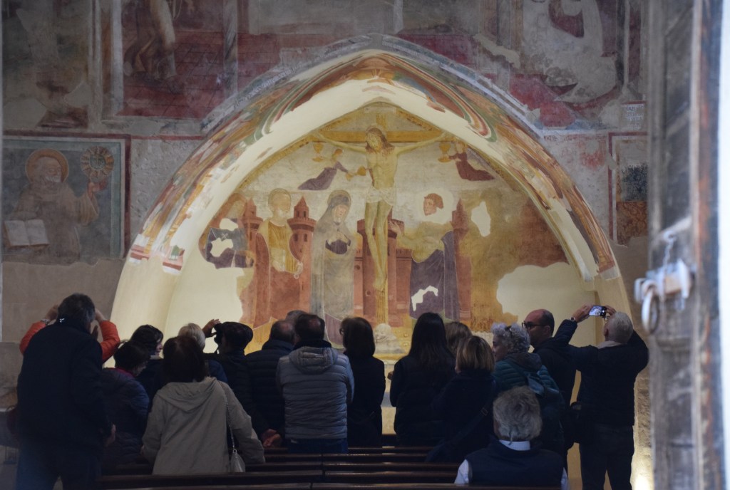 Given that March is ‘off-season’ for tourism at the lake, most of the visitors to the oratory were locals. The ancient art of Italy is beloved to Italians. This photo of the chancel wall (front altar) of the presbytery shows a group of enthusiastic visitors viewing the crucifixion scene. I love this photo for the joy in culture to which it testifies. The fresco dates to 1476. At the feet of the crucified Christ is (from the left) Mary Magdalene, Saint Peter, the Great Virgin, and John the Evangelist.