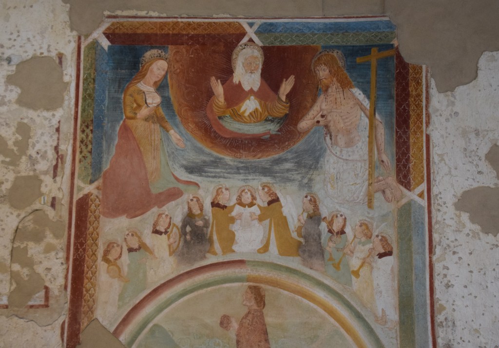 This fresco is located on the right or south wall. It depicts the Virgin Mary and a flogged, tortured, and crucified Christ newly risen from death. God the Father and the dove representing the Holy Spirit are in the center. The Father looks at Jesus who – along with his Mother – bows his head in deference. At the feet of the holy figures are musical angels. The center angel is singing from a sacred script that is being held by two flanking angels. Beneath everything is a kneeling donor – hat in hand – who is not identified but whose likeness may be authentically represented as was often the custom employed by artists.