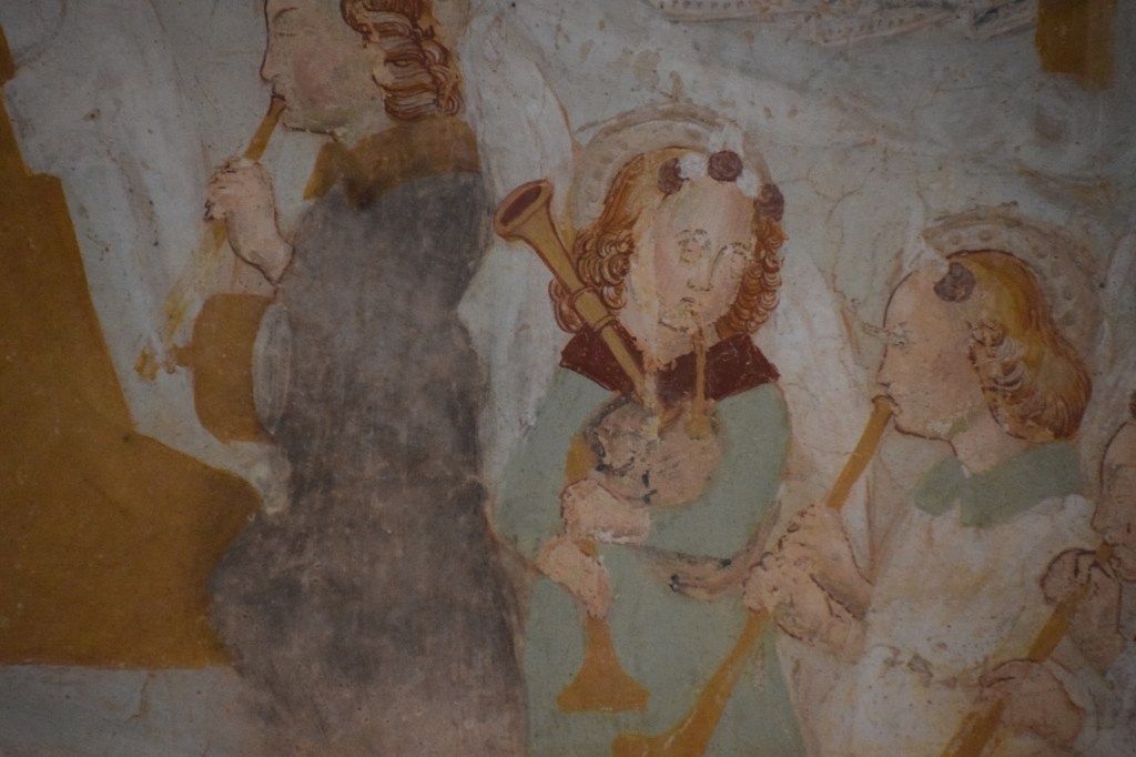 The second interesting aspect of this fresco is the musical angel – in green – and the third from the right – who is playing bagpipes! Although the bagpipes are an ancient instrument (which we currently associate with Scotland) I have never encountered a musical angel playing bagpipes. When I pointed this out to the docent she admitted this detail was not noticed. I love this wonderful fresco!! Such a fabulous work of imagination and vision by the artist deserves not to go unrecognized!!