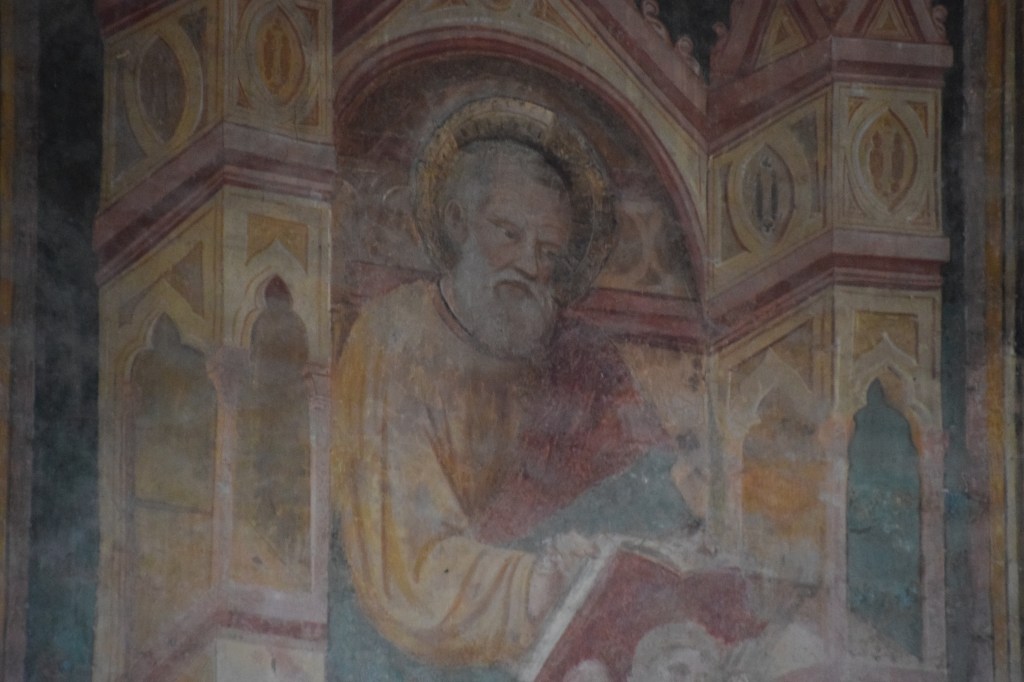 Beneath the altar apse mosaic of Mary is a fresco depicting the four evangelists. This is Saint Mark. The frescoes date to the 13th-century.