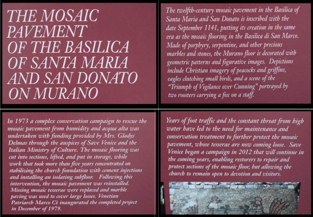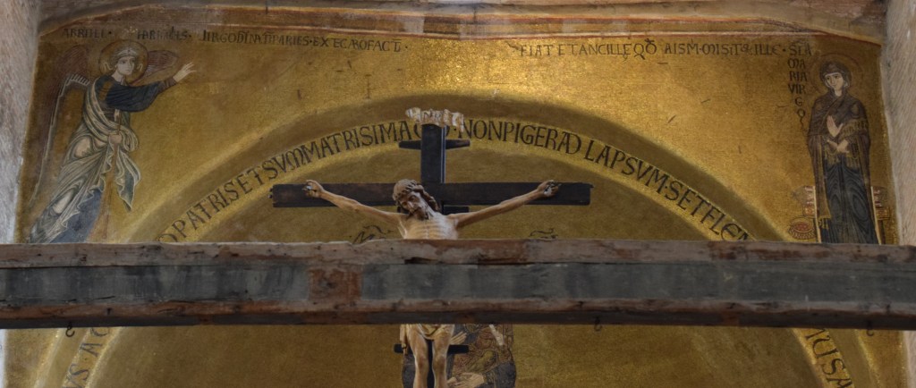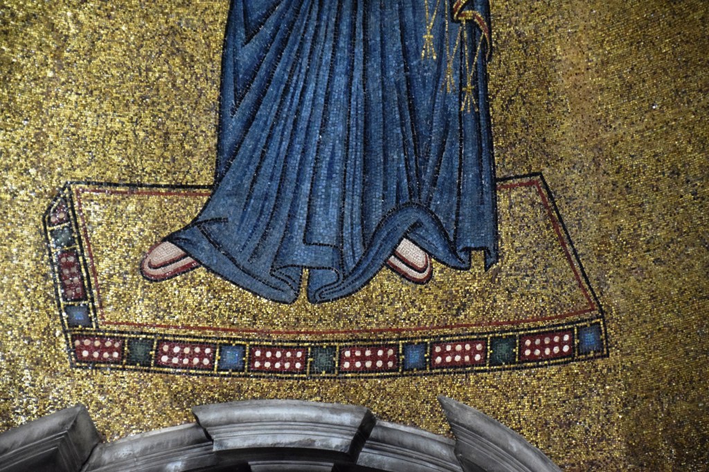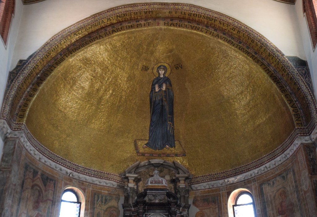To assuage my nostalgia and to share the beauty of the basilica, here are a few photos of the Duomo of Murano – the 7th-century Basilica di San Donato. I actually missed this church on my three previous trips to the floating city and island likely because the focus in Murano is the fabulous glass furnaces and products there. But this basilica rivals those of Ravenna and Rome. The Cosmati floors and the altar apse mosaic of the Theotókos – the God-bearer – are heart-stoppers. Enjoy the photos and have a great day!