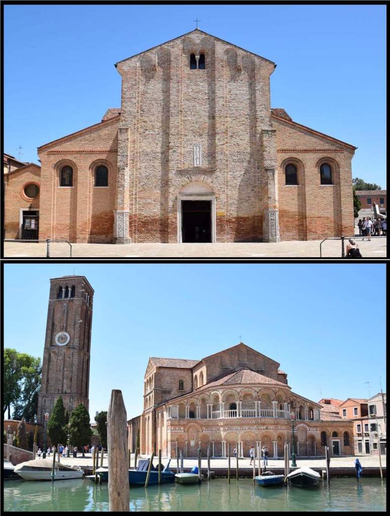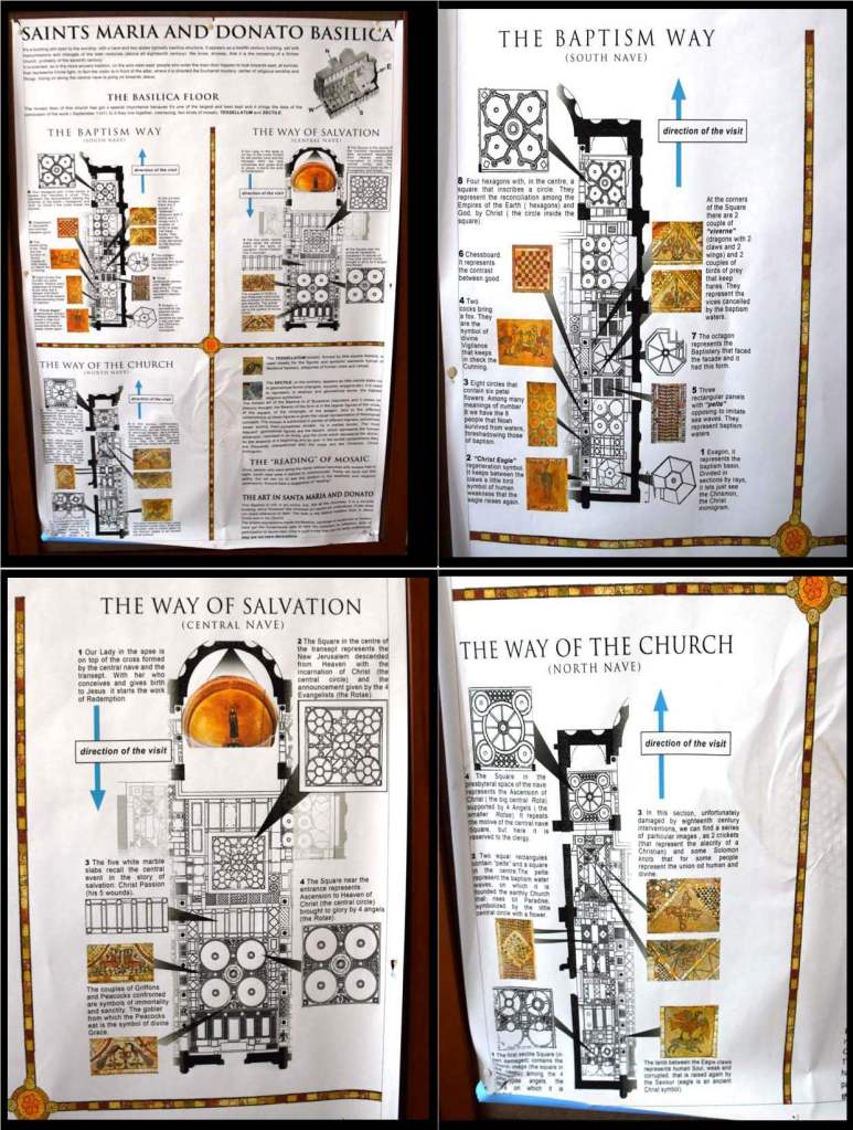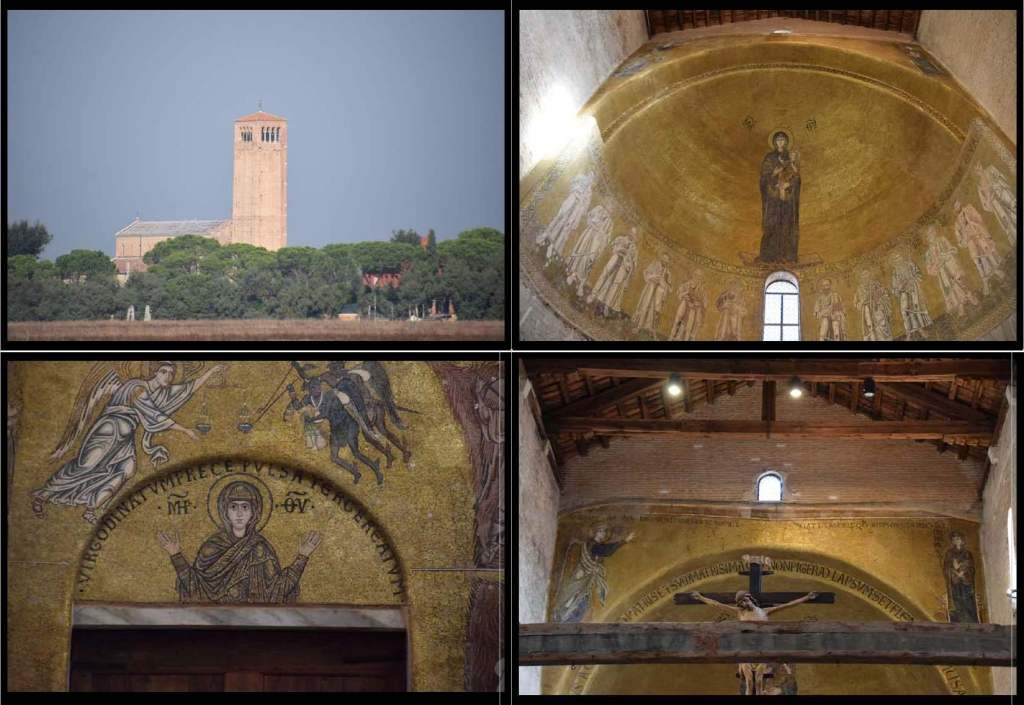 Here is a montage of some of the mosaics of the 7th-century Basilica di Santa Maria Assunta. Clockwise from the top left is a view of the cathedral from the lagoon, the apse mosaic showing the Madonna and Child with the twelve apostles below, the Annunciation of the triumphal arch, and Mary as the Theotókos – the God-bearer in the position of Orante – one who prays. In general, photos are not allowed. However during the pandemic – the time of this visit, the docents were not vigilant. Unfortunately, the lack of light and the gloss of the mosaics make good photos difficult.