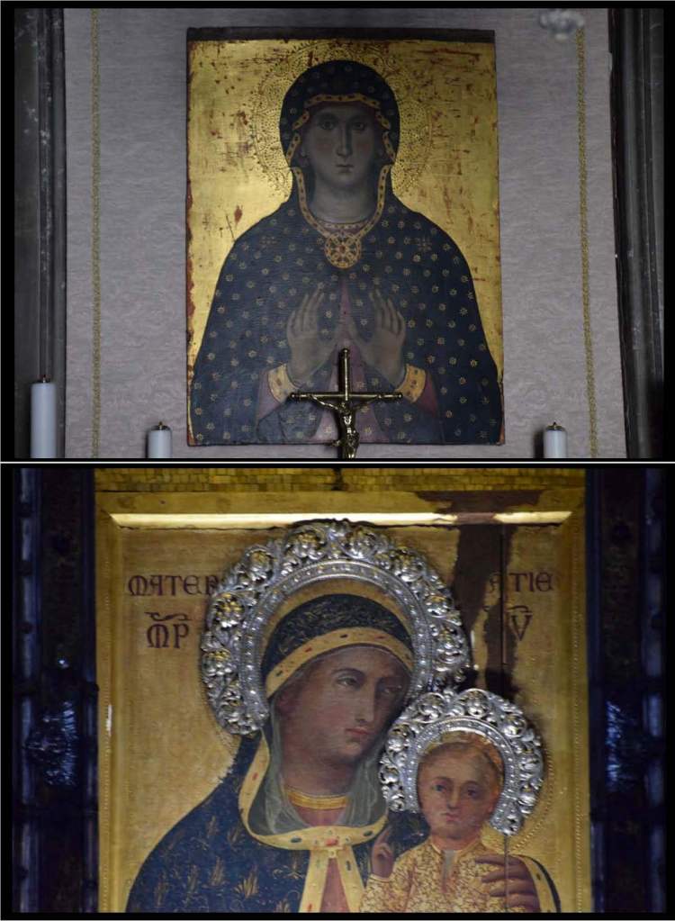 The cathedral possesses two 13th-century icons of the Virgin Mary. The montage – on the top – shows Mary as the Theotókos and Orante – again painted in Byzantine style. The icon on the bottom is of the Madonna and Child. Because the painting was displayed in a lighted, glass case I had to take a ‘detail’ photo in order that the images not be washed out by the glare of the light on the gold background. The images of Mary and Jesus are adorned with silver and gold crowns to indicate that miracles are attributed to this particular icon.