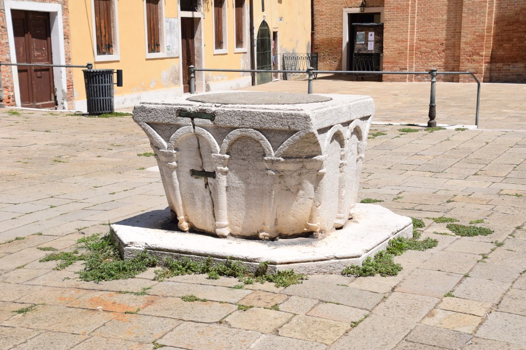 The central piazza or campo of every sestiere in Venice has a freshwater well kept pure and free of salt water by a remarkable ancient system. Venice supplied fresh water using an ingenious method of collecting rainwater – the only unsalted water source for the city. For each freshwater well, a large open space was needed. Hence, wells are only found in the campo’s and piazza’s of the floating city and its islands. The squares were then dug out to a depth of about 6 meters – approximately 20 feet. The excavation was then lined with clay. Next, stones and sand taken from nearby rivers were used to line the clay ‘pits’ – if one can call them that. This made the bottom impermeable or water-resistant. The excavation was then filled. Finally, a series of gutters were built around the well that drained the rain waters from the square into the bottom of the well. The ‘chimney’ of the well itself, beneath the surface of the square, was made of a porous brick that allowed the rain waters – filtered through the layers of sand and stone – to seep into the well and fill it. Water was then drawn out by a bucket. I do not know whether or not any well is still in use – I have never seen one ‘open’. And I have never noticed any system of gutters. Perhaps they have been covered over. This is the freshwater well of the Campo di San Donato.