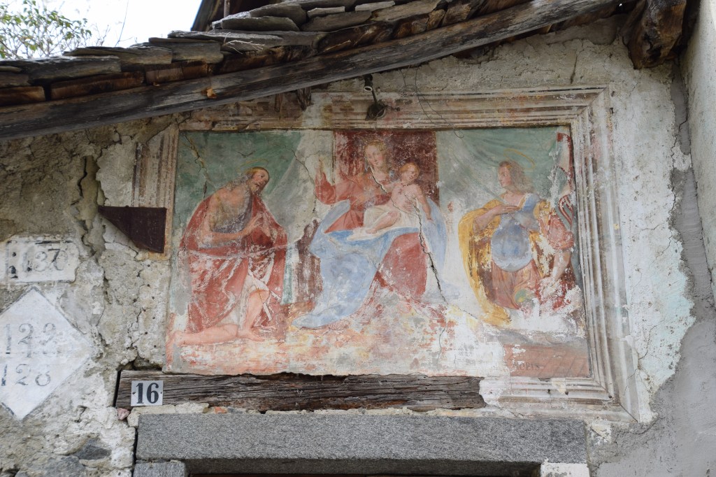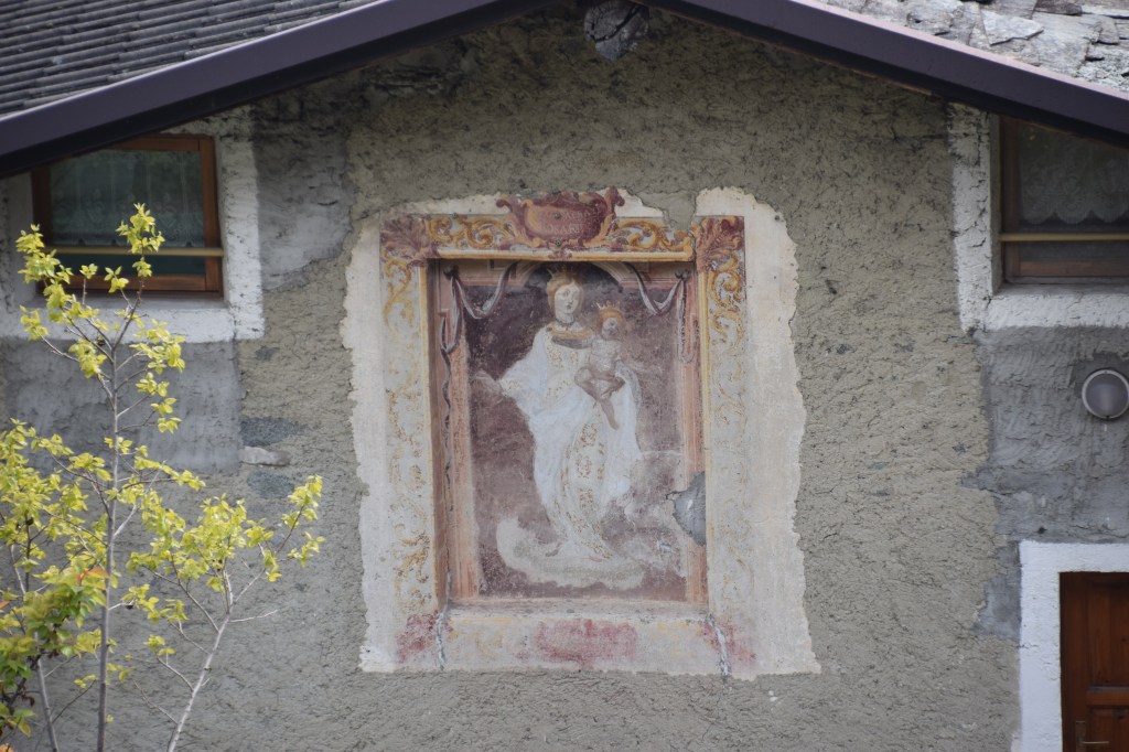 I end my walk in Traona with a Wall Madonna from the via Ca’ Rossa. This is a wonderful – poorly restored late 17th or early 18th-century Vergine Assunta. The Madonna is flanked by two Archangels. I hope you have the opportunity to visit the Valtellina and walk the roads of Traona enjoying the astonishing views and Wall Madonna’s!