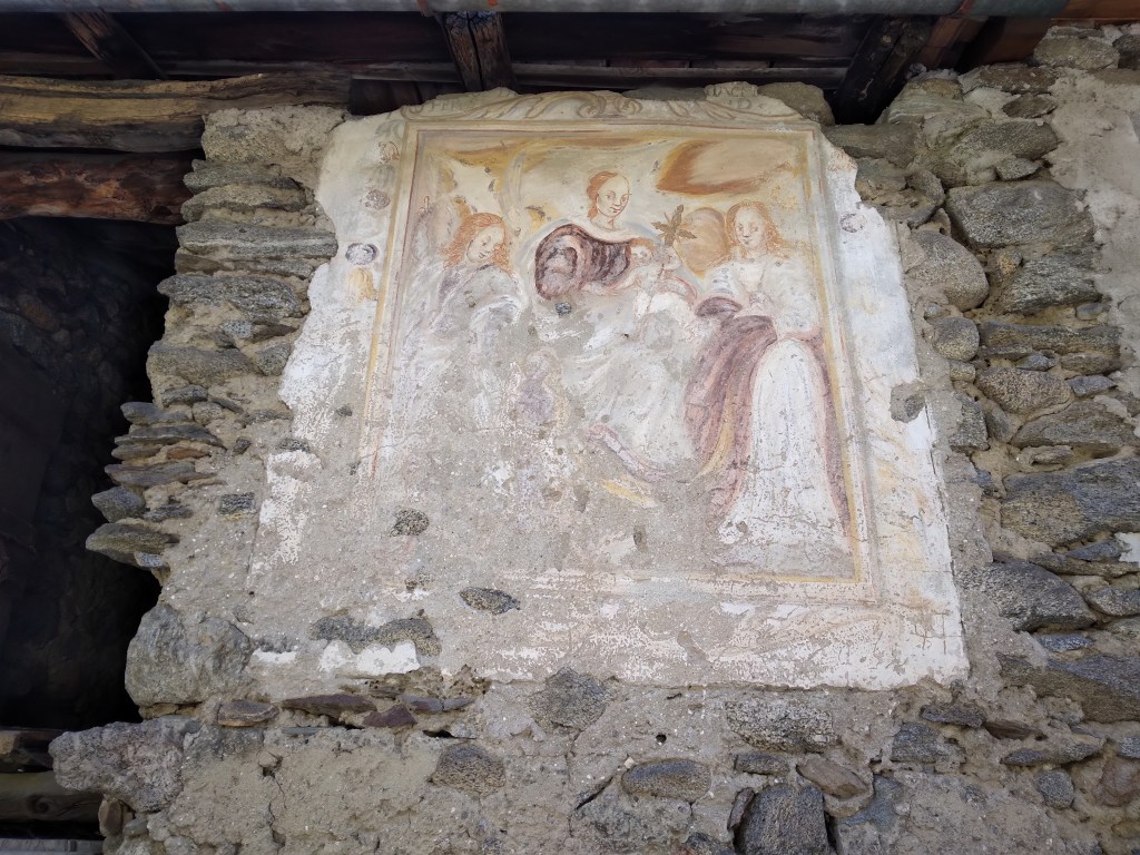 I speculate that the date for this fresco is late 17th to mid 18th-century based on a number of things: 1. the mule path on which the large villa is located, 2. one of the other houses on the via per Traona with a cornerstone dated 1695, 3. the depiction of Mary, 4. the imagery, and 5. the fact that Jesus is wearing a coral necklace. The addition of the coral necklace identifies the donor as having some association with southern Italy and the migration to Sicily for work. Perhaps the owner of the home was a migrant who returned Traona affluent! If anyone has another analysis or theory – please comment! I welcome the insight!