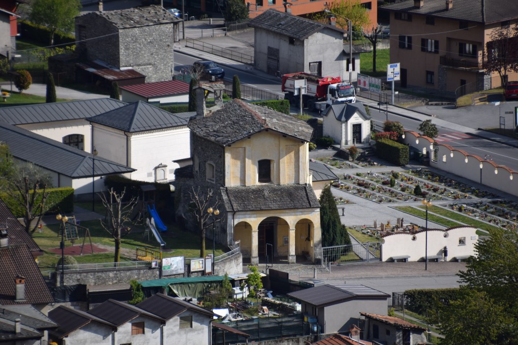 One might note that the address of the Chiesa di San Colombano is given as: Presso il Cimitero di Traona, Via Valeriana – At the Traona Cemetery, via Valeriana. Burials in ancient times occurred outside city walls to curb disease caused by bacteria from the decaying bodies. This was a logical approach to death and served both the requirements of Catholicism which forbade cremation and the public health needs associated with the many plagues that periodically – and rapidly – decimated the populations of the villages of the Valtellina. After bodies decomposed, the bones would be dug up and buried in a common tomb inside the parish church or in an ossuary in the church courtyard. It was common for there to be separate tombs for women and men, for clergy, and dedicated tombs for wealthy or powerful families.