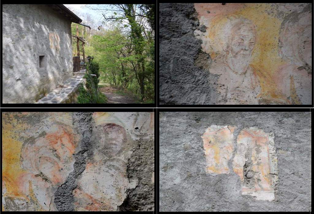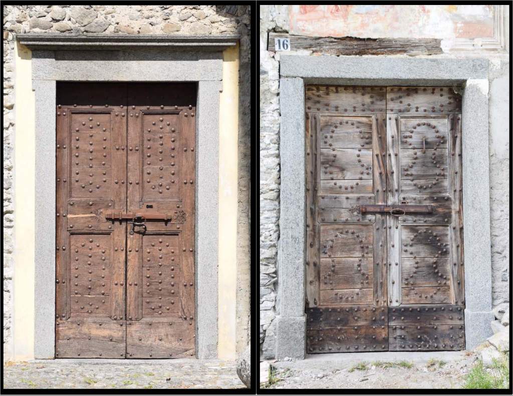 This montage offers four wonderful, wooden doors: From the top left – the entry doors to Chiesa di Sant’Alessandro; top right and bottom left – doors found in Moncucco Basso, bottom right – a door from the second home in from the Traona side of the via per Traona. This door had a preserved colored frame from a totally eroded Wall Madonna. You can see some of the colors right above the lintel.