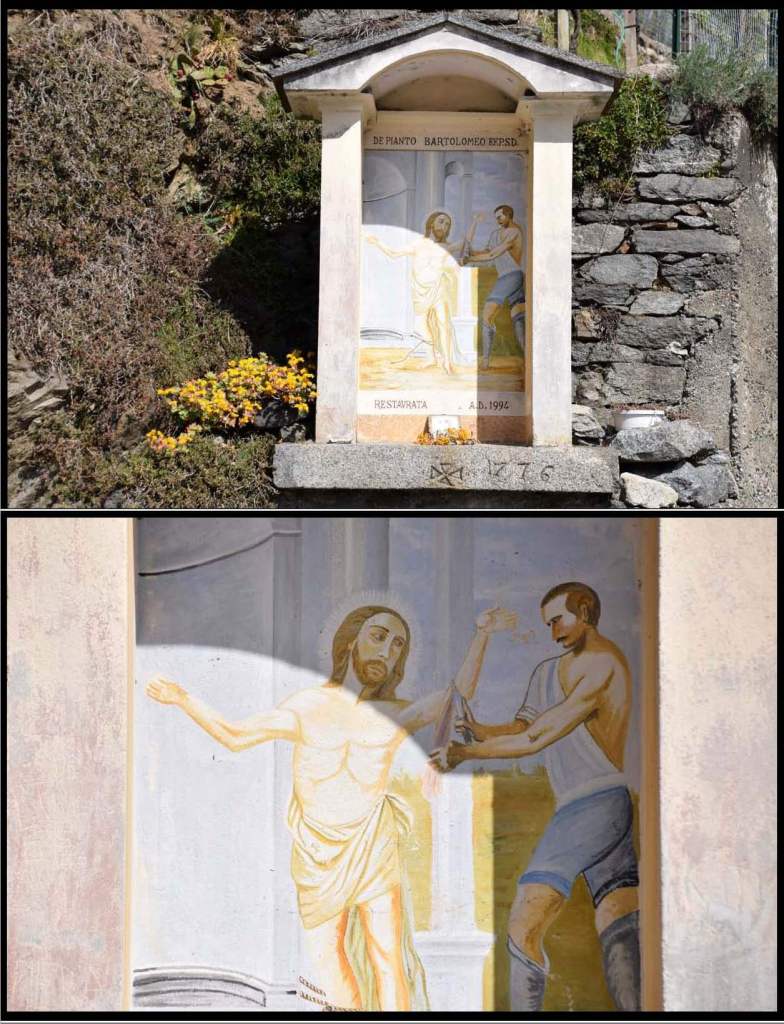 There are three shrines on the via Pianezzo. Two of them are Madonna shrines and one is a shrine depicting the martyrdom of San Bartolomeo who was skinned alive. Each of the Madonna shrines on via Pianezzo lies on an old mulattiera – mule path. These were the original roads people used to reach the three localita’s located above Traona on the mountainside – Moncucco Basso, Moncucco Alto, and Pianezzo. All the mulattiere are still kept clean and functional since one – via per Traona – is wide enough to be a carriage road, and the others are shorter routes to the homes above and access paths to the vineyards and olive groves on the mountainside.