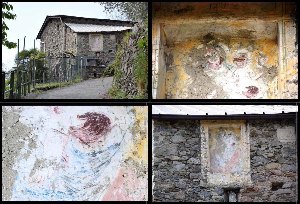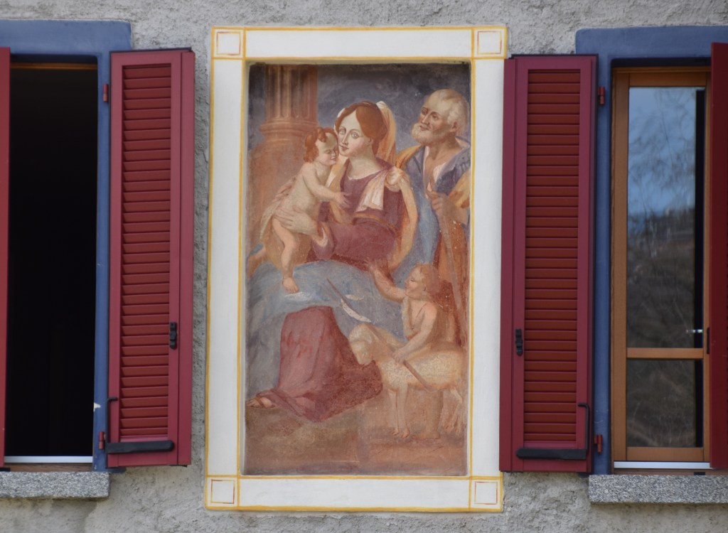 This is the first house on the old mule path. This Madonna faces the via per Traona. The home is very large – 440 m2 – and has its own consecrated church. It is for sale on Immobiliare with no price listed. ‘Price on Request’ is noted in the ad. The fresco has been restored. It is a Sacra Famiglia with a young St John the Baptist.