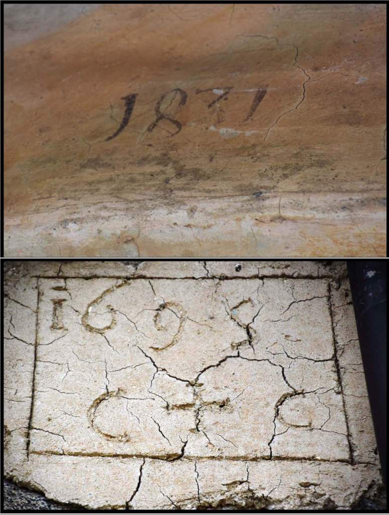 The date on the top of the fresco is 1831, and the stone dating the home is carved with 1695. I do not know what the C – cross – C means. That is a carving of a cross and is not a +. The date of the fresco is likely a date of restoration. The original fresco would be the same age as the home – late 17th-century.