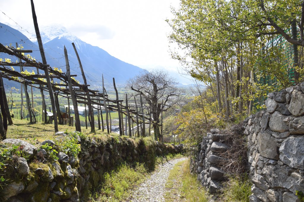 It has been was sunny and cool lately – gorgeous days in the Valtellina. I have wanted to walk the four lateral roads that connect the mountain towns of Cercino and Traona. Two of the roads are unnamed and three are mostly unpaved. Only one can be called a modern, asphalted carriage road. This is the road on which one traverses the scant 1/2 kilometer to meet the lower of the last two tornante’s on Strada Provinciale 5 – SP5 – into Cercino. Above this paved road is another much older road – via per Traona. And above that is an unpaved, agricultural road – still drivable – that leads to Pianezzo – the largest of three hamlets belonging to Traona. The first lateral road between the villages – just outside Piussogno – is the via Ca’ Rossa along which thrives a vibrant viniculture.